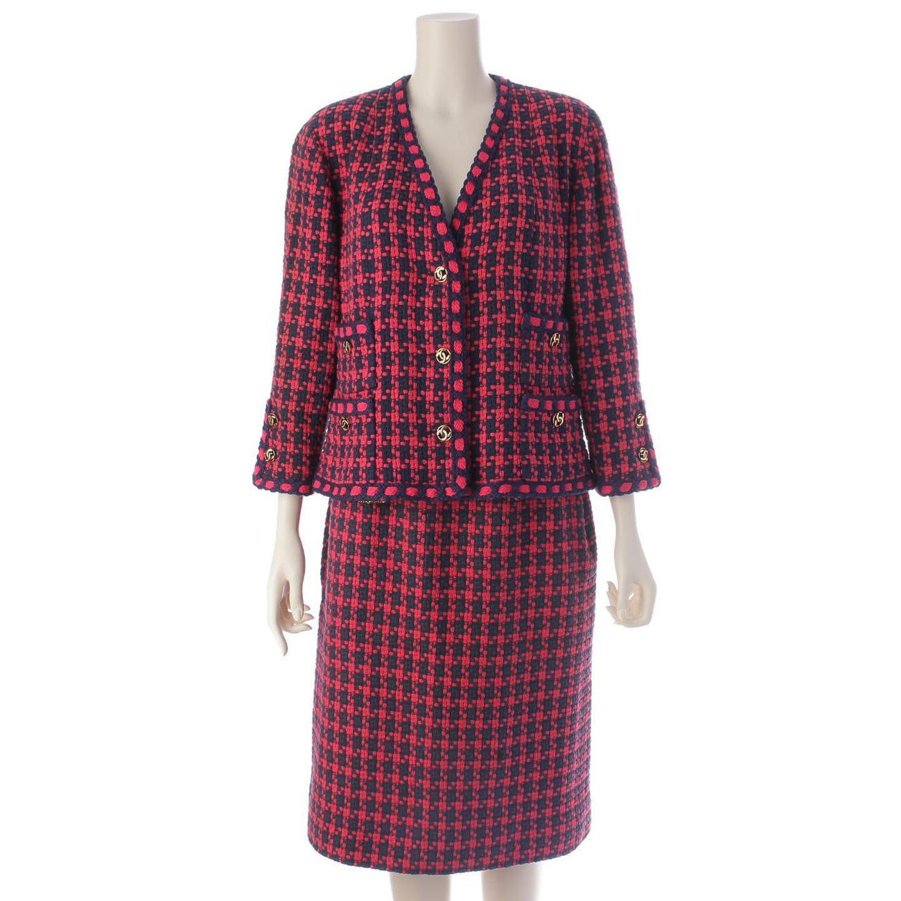 シャネル ブティック コットン ツイード ココボタン 千鳥格子柄 トリム ジャケット スカートセットアップ ヴィンテージ ピンク ネイビー 40