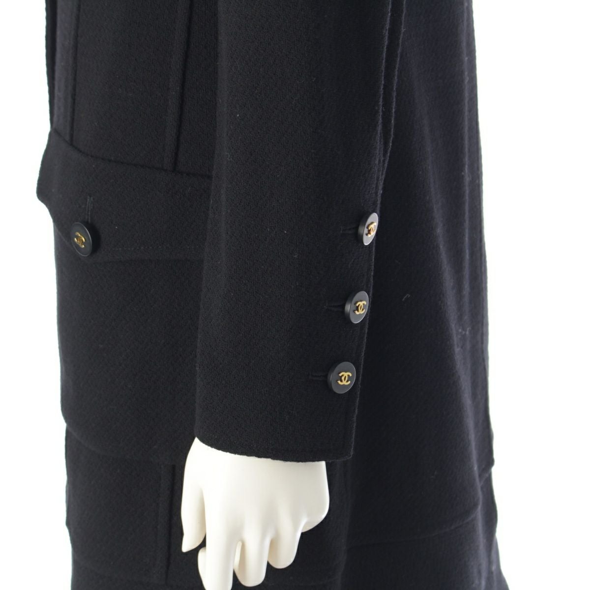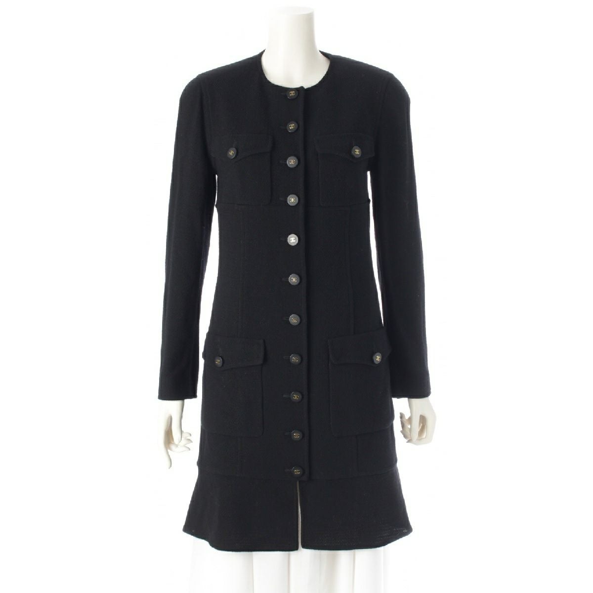シャネル 94A ウール ツイード ヴィンテージ ココボタン ノーカラー ロング コート 4ポケット ワンピース ドレス P03699 ブラック 38