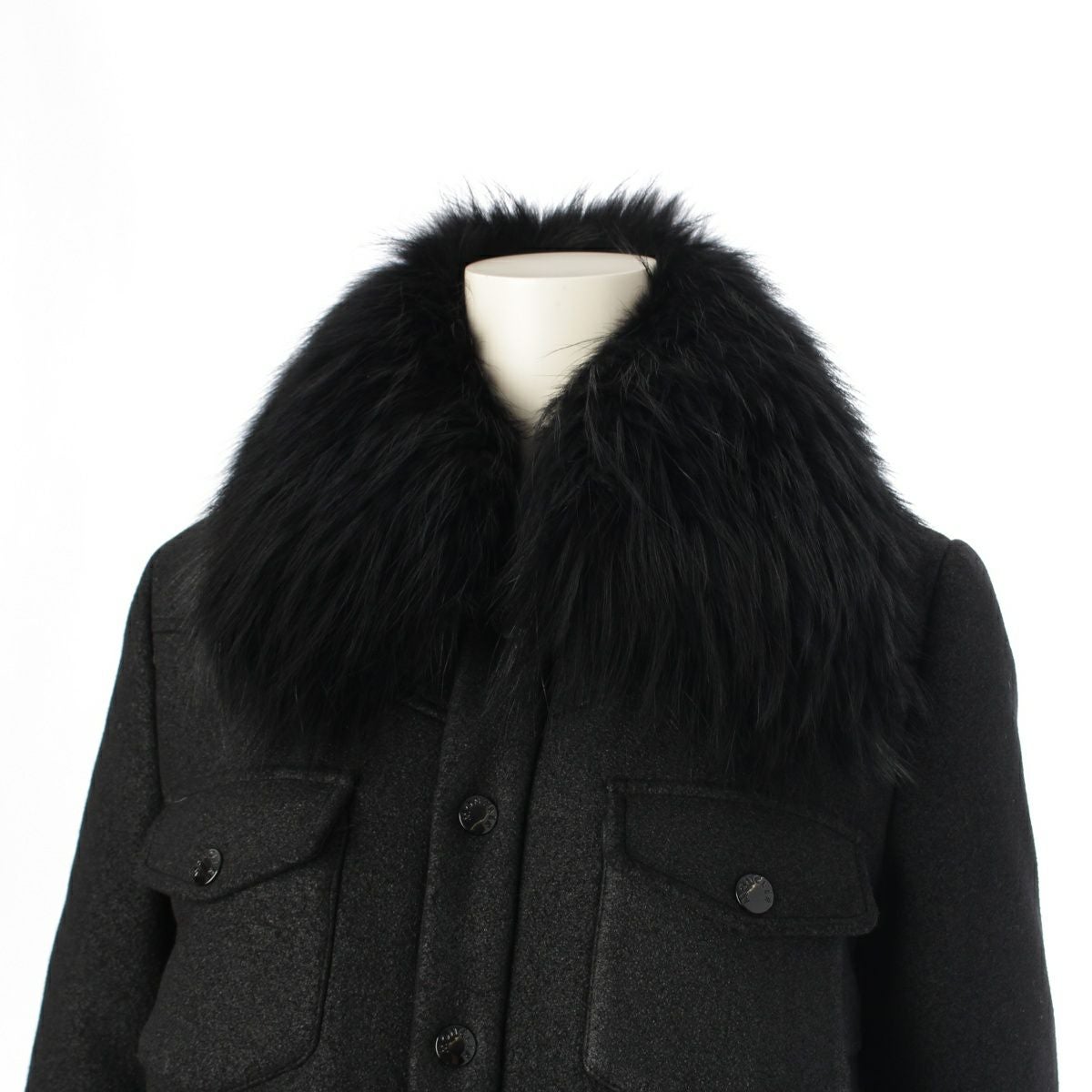 ダメージ箇所: ファーに毛羽立ち、ボタンに傷、保管臭のようなニオイ