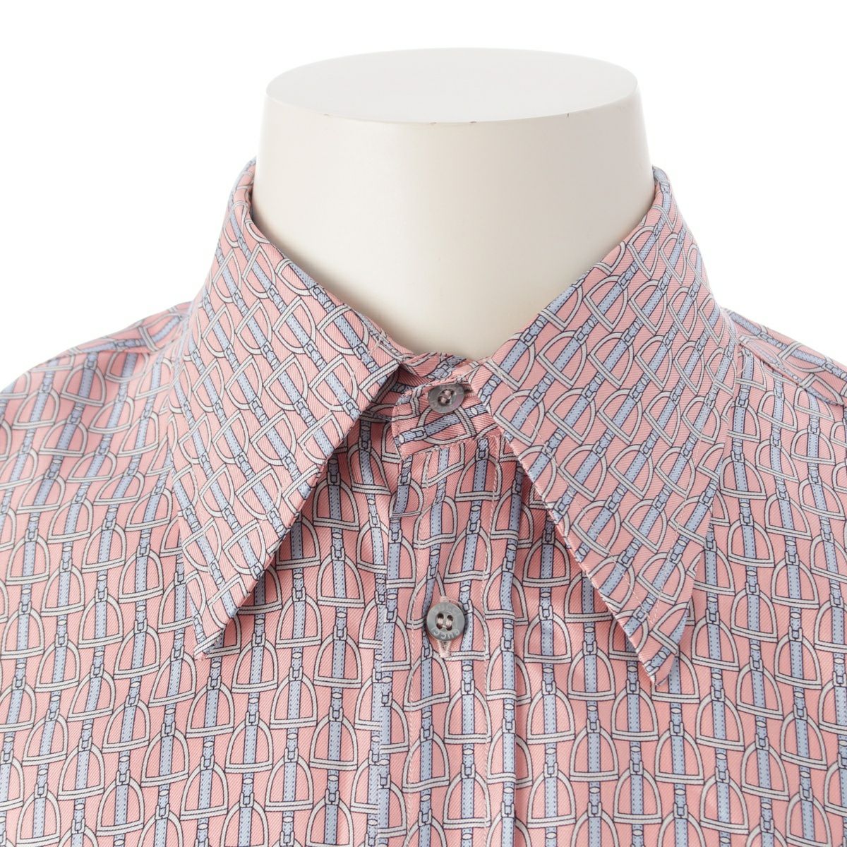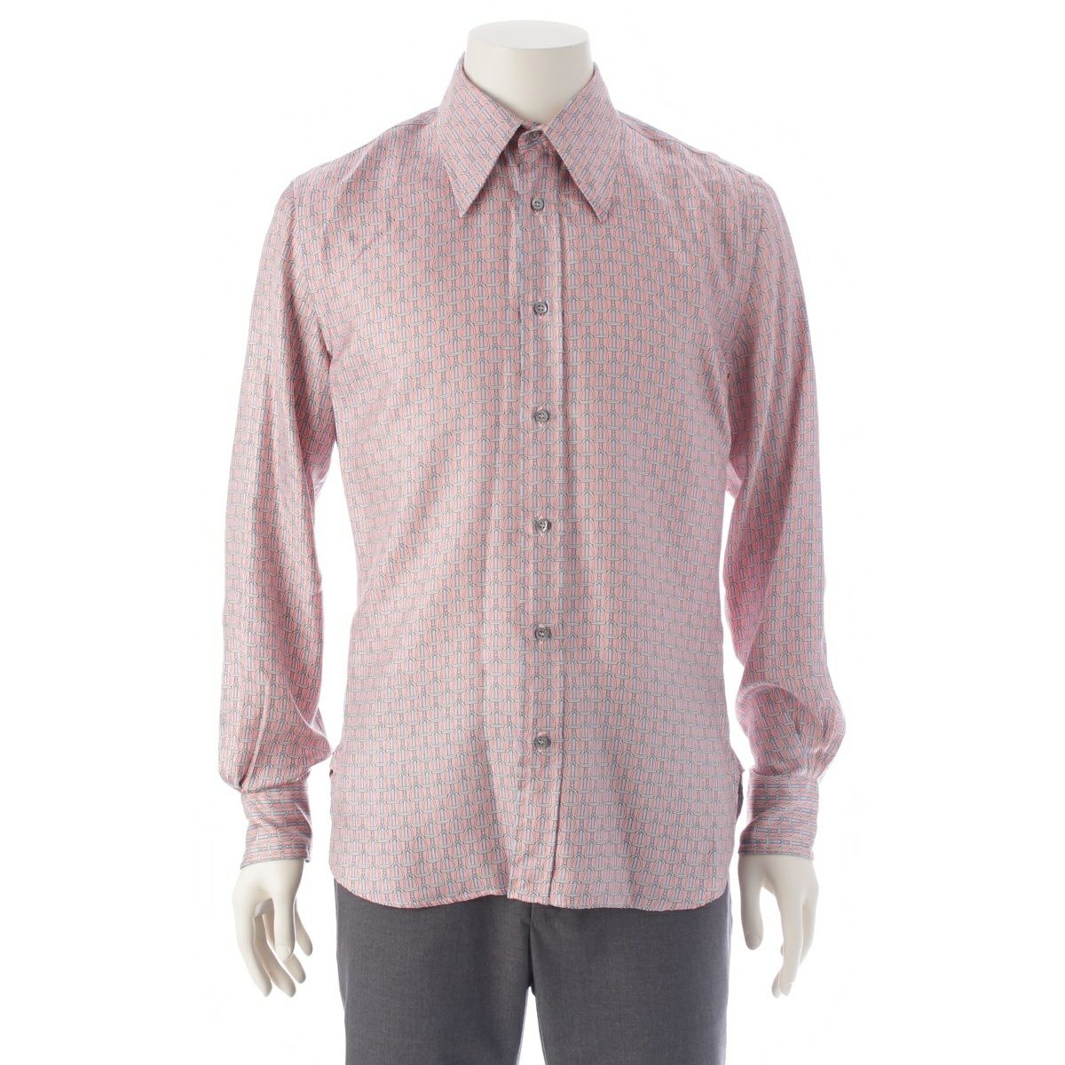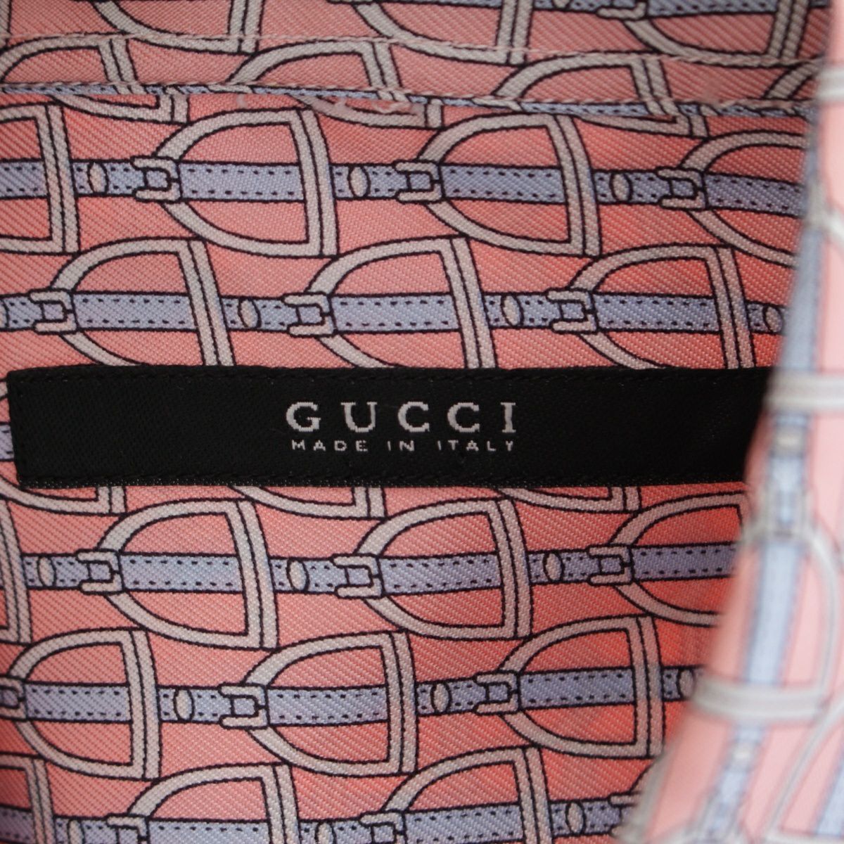 グッチ シルク ベルト柄 ロゴボタン 長袖シャツ ピンク×ブルー 40 15 3/4
