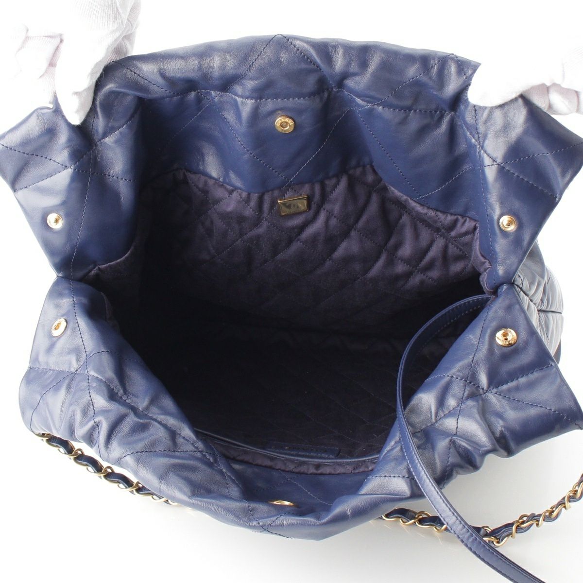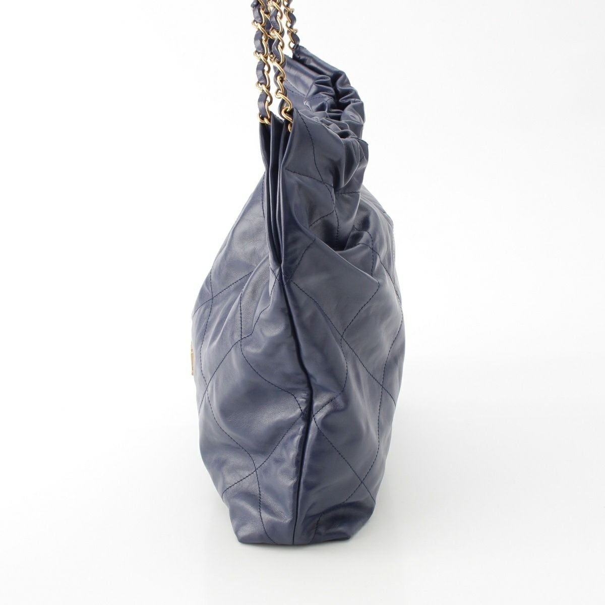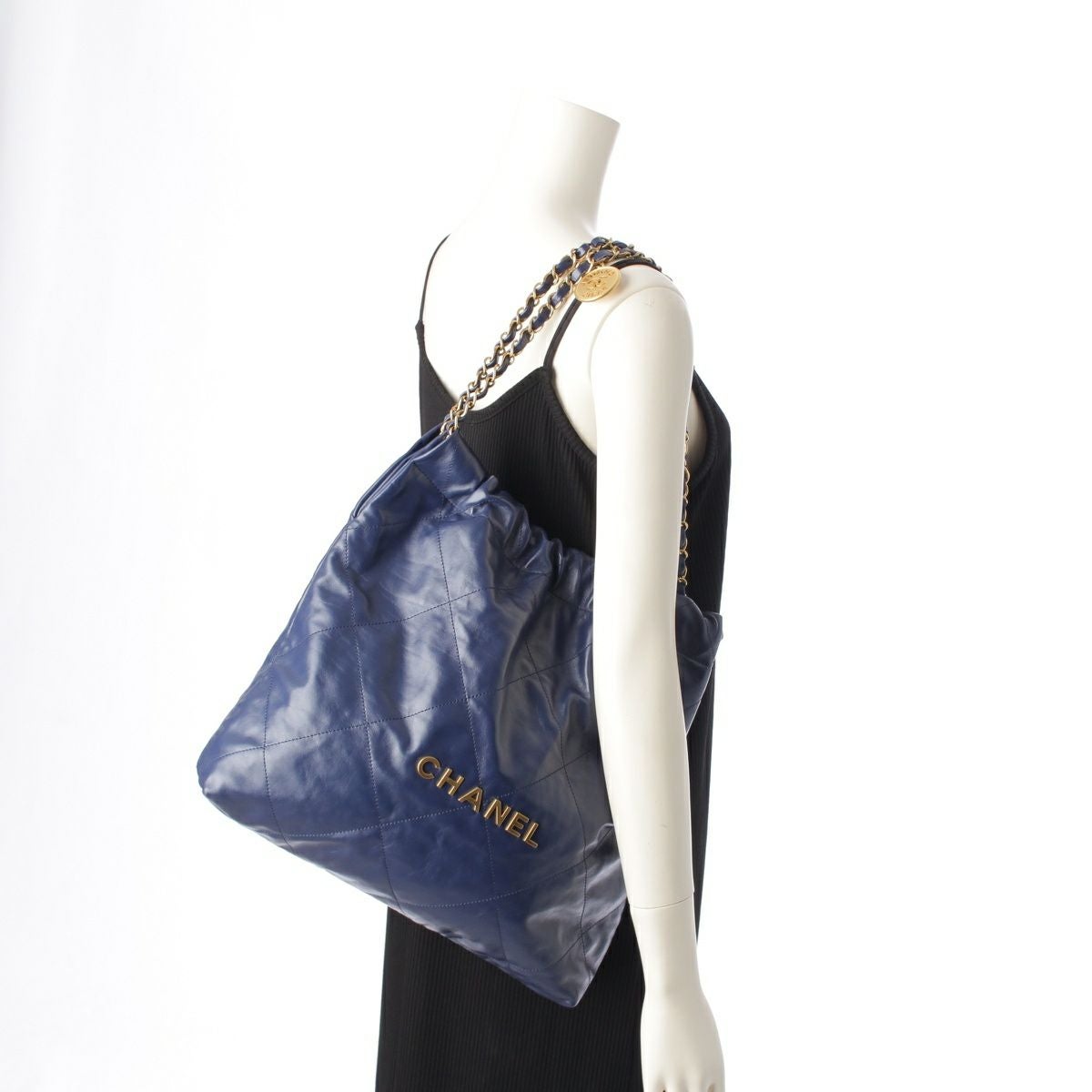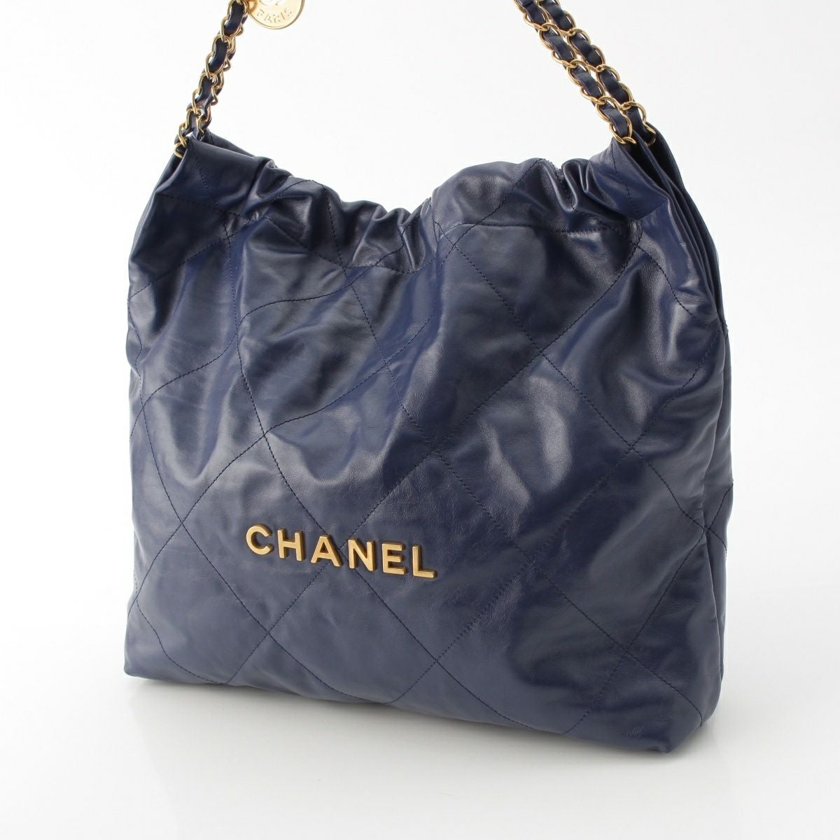 シャネル 22 シャイニーカーフスキン ラージ ロゴ チェーン ショルダーバッグ ネイビー