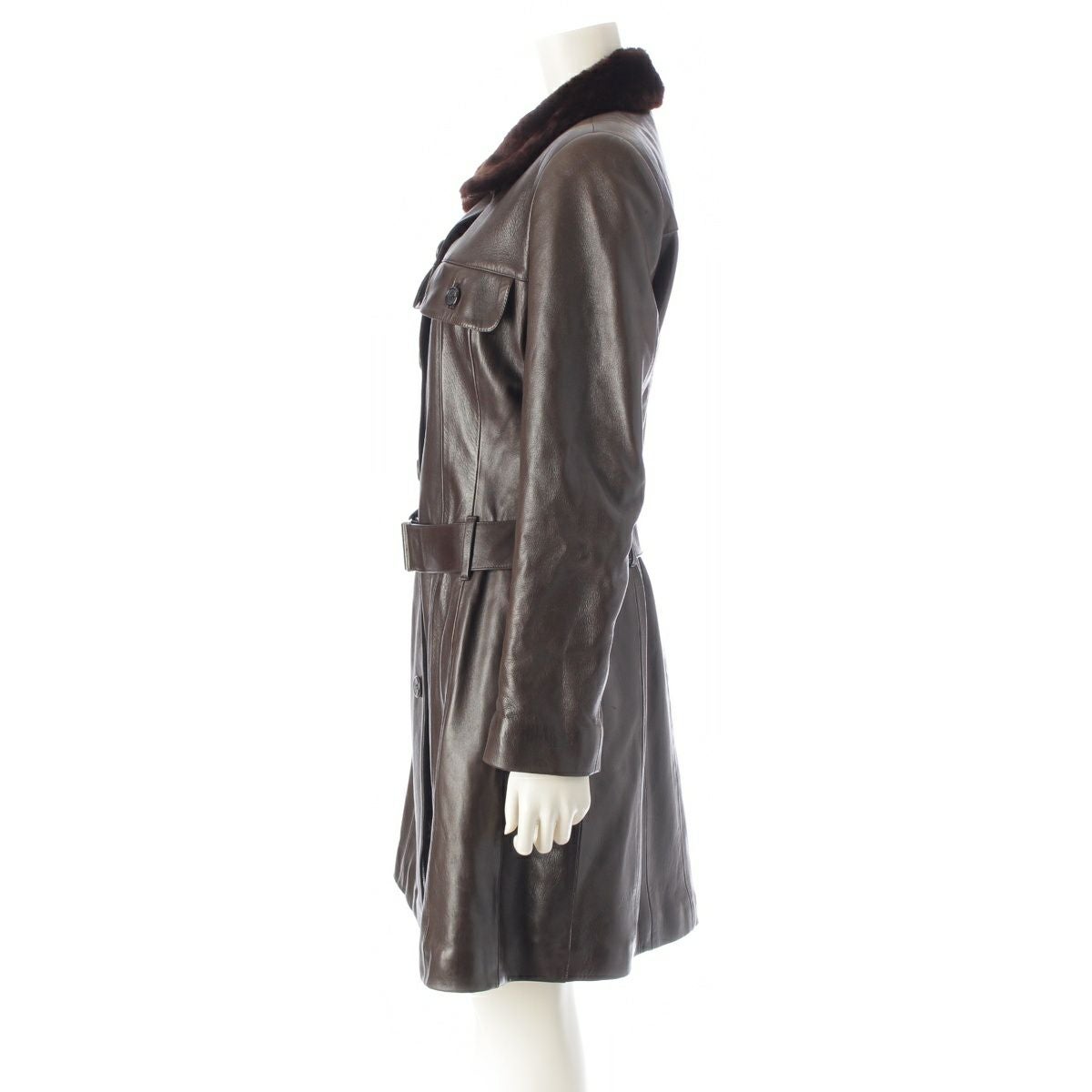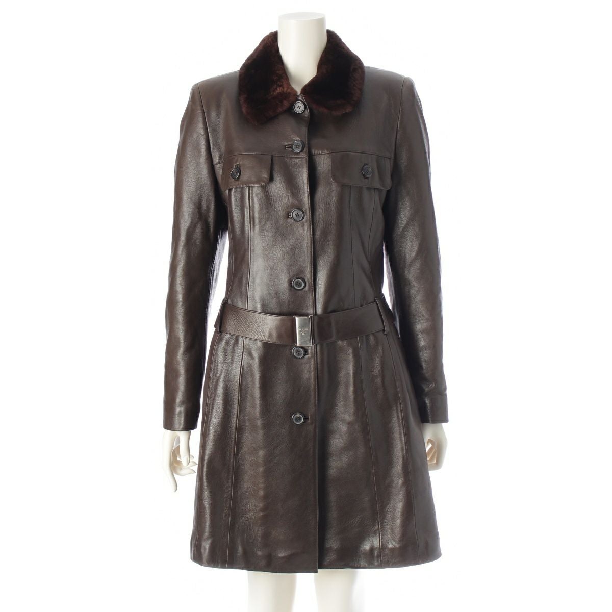 プラダ 1994F/W レザー アクリルファー 襟 ベルテッド コート ブラウン 42
