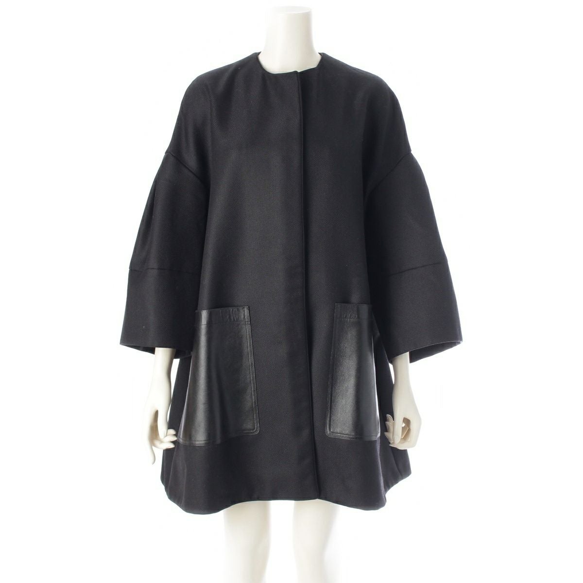 ドゥロワー ウール モヘア ケヌキ レザー ポケット ノーカラー コート アウター ブラック 36