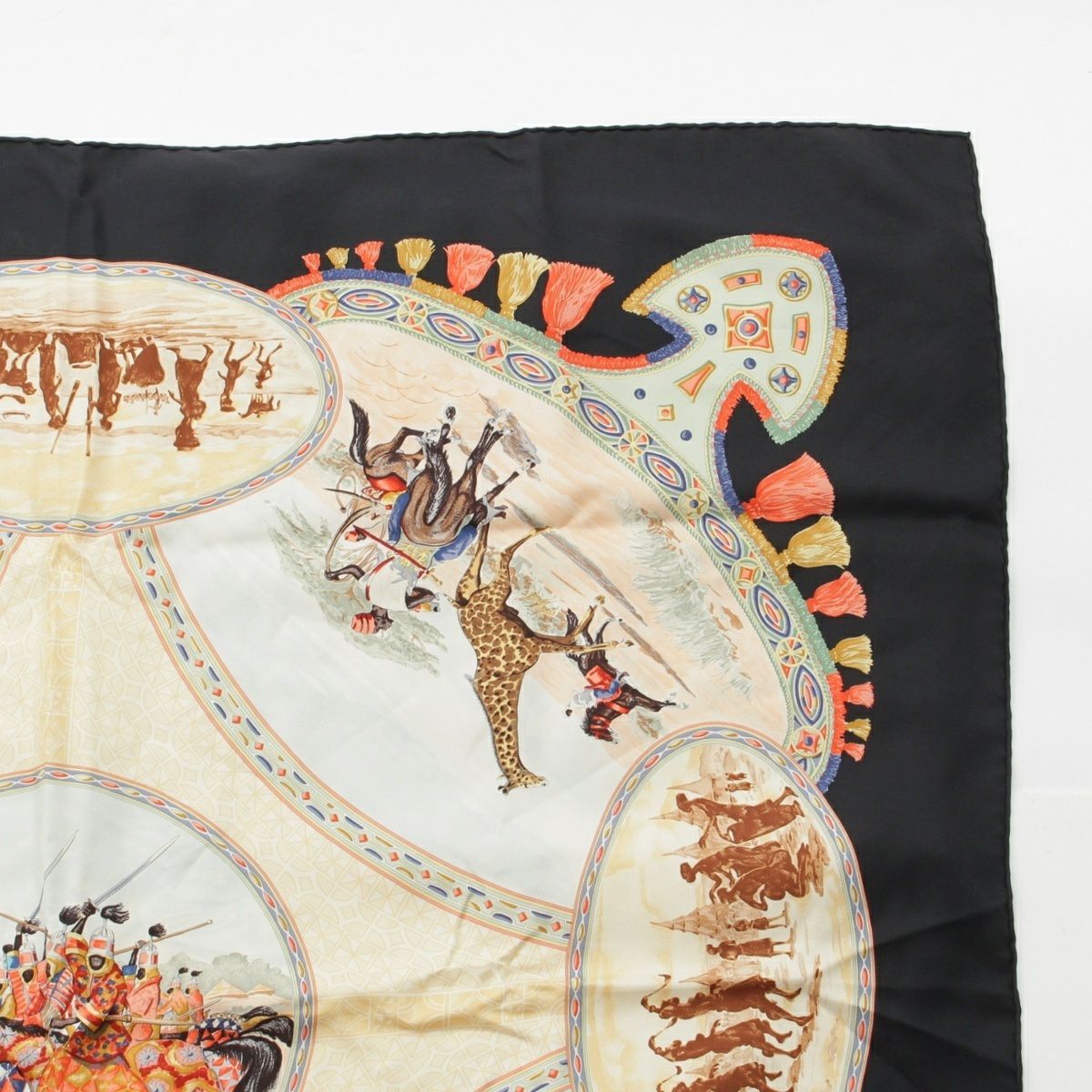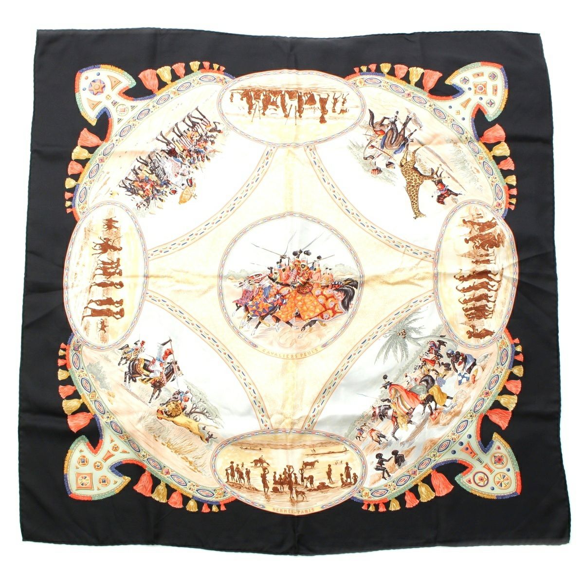 エルメス カレ90 CAVALIERS PEULS プール族の騎手 シルク スカーフ ブラック系 マルチカラー