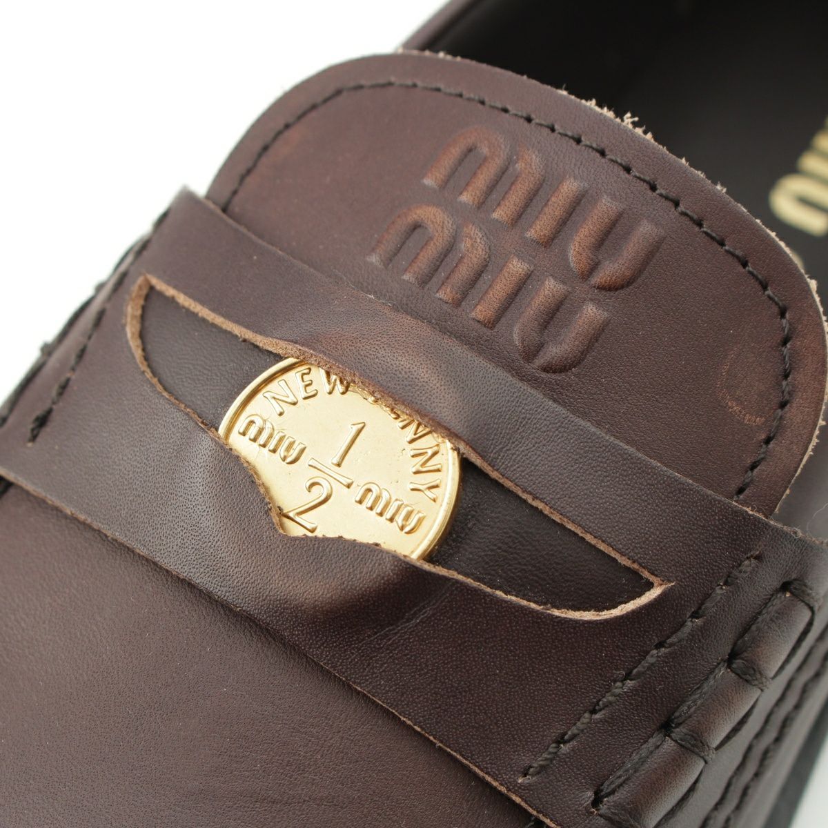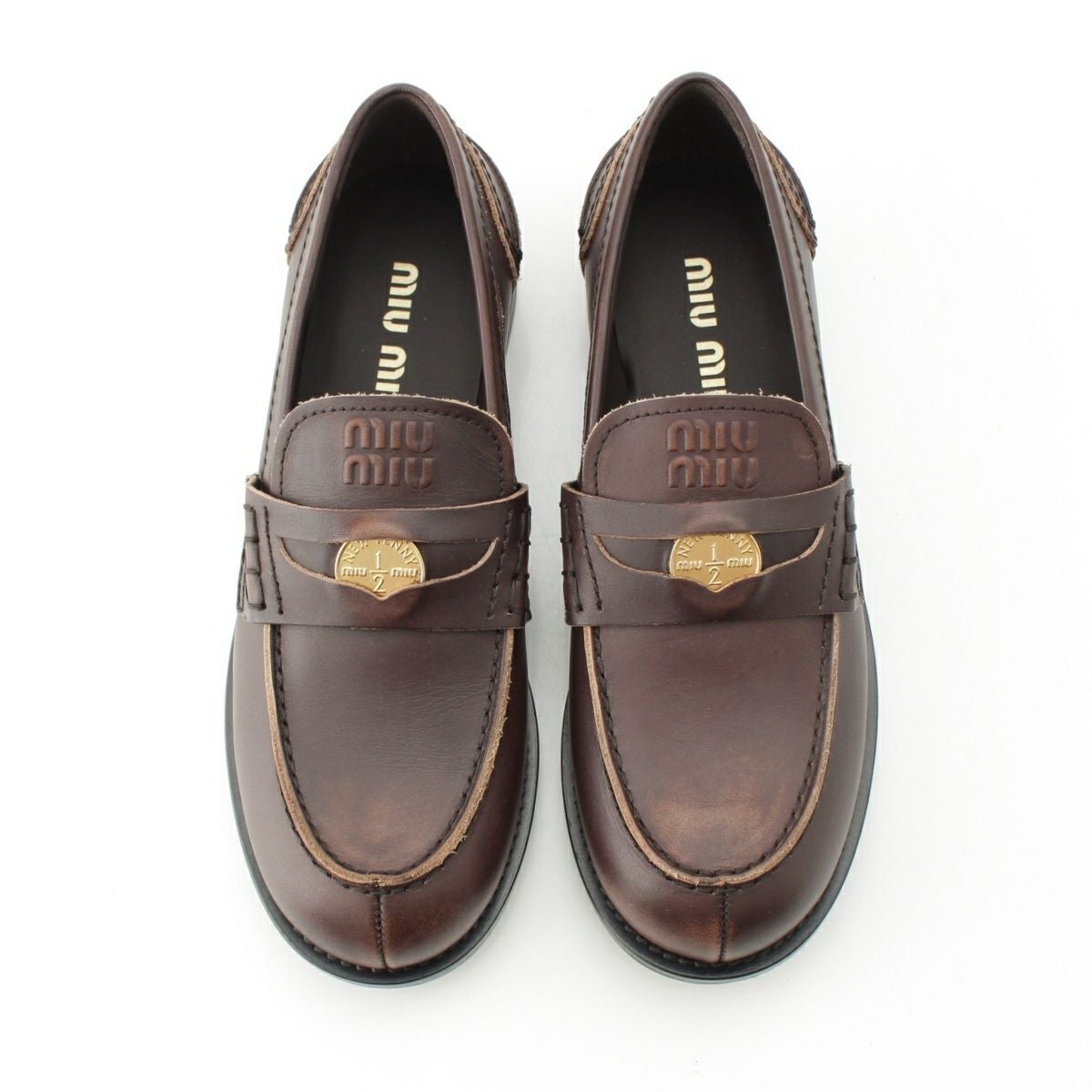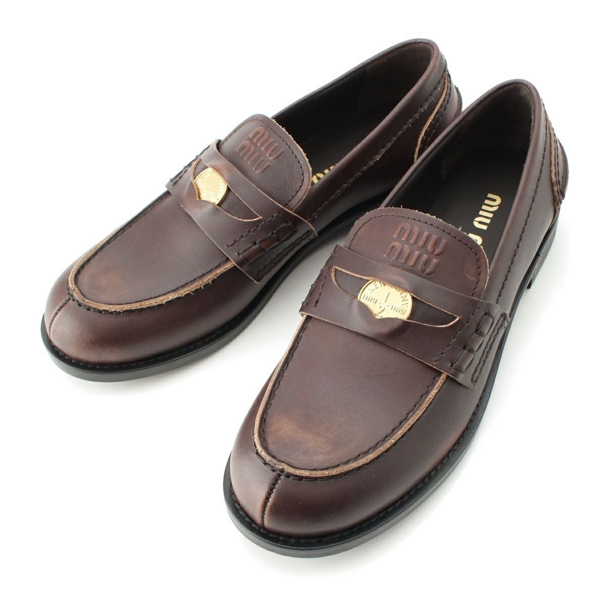 ミュウミュウ レザー ヴィンテージ加工 ペニー コイン ローファー シューズ ダークブラウン 38