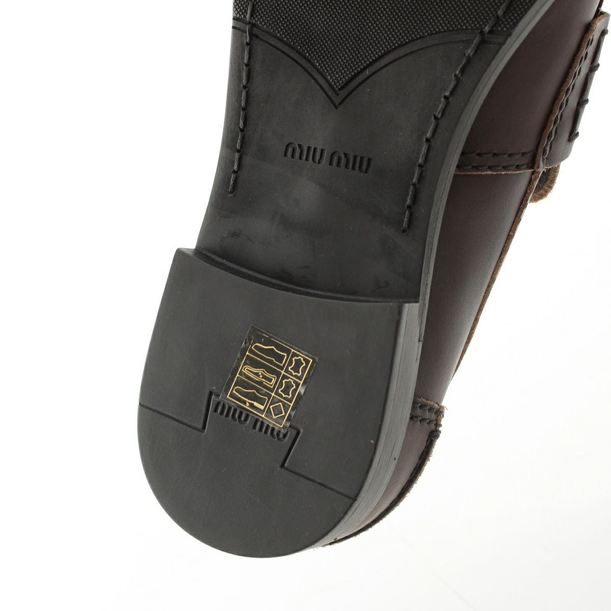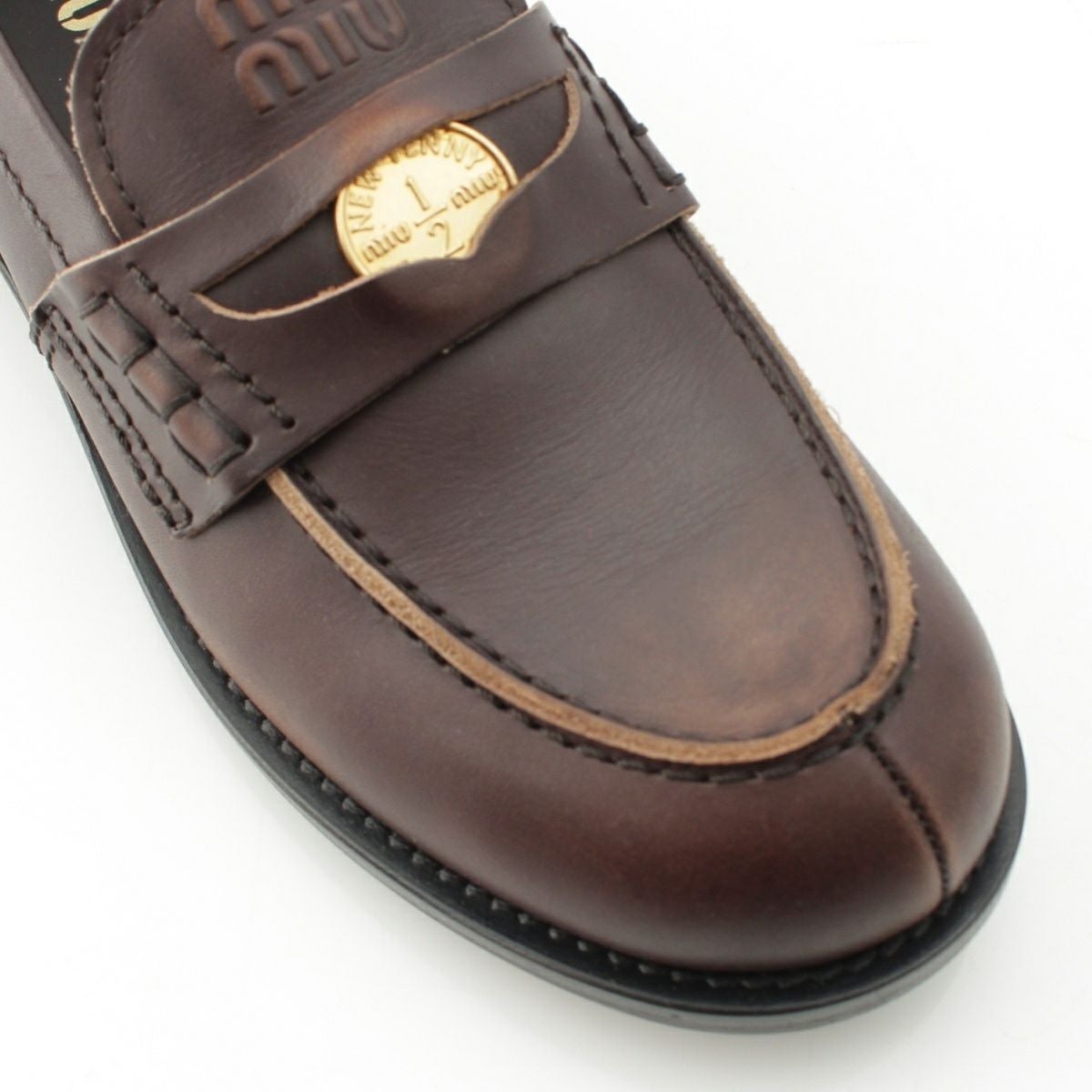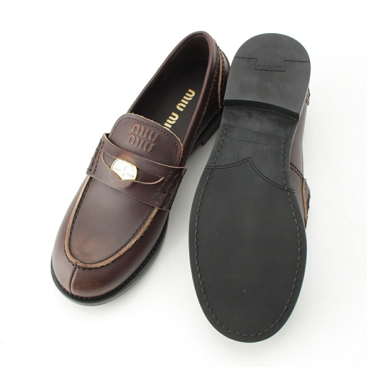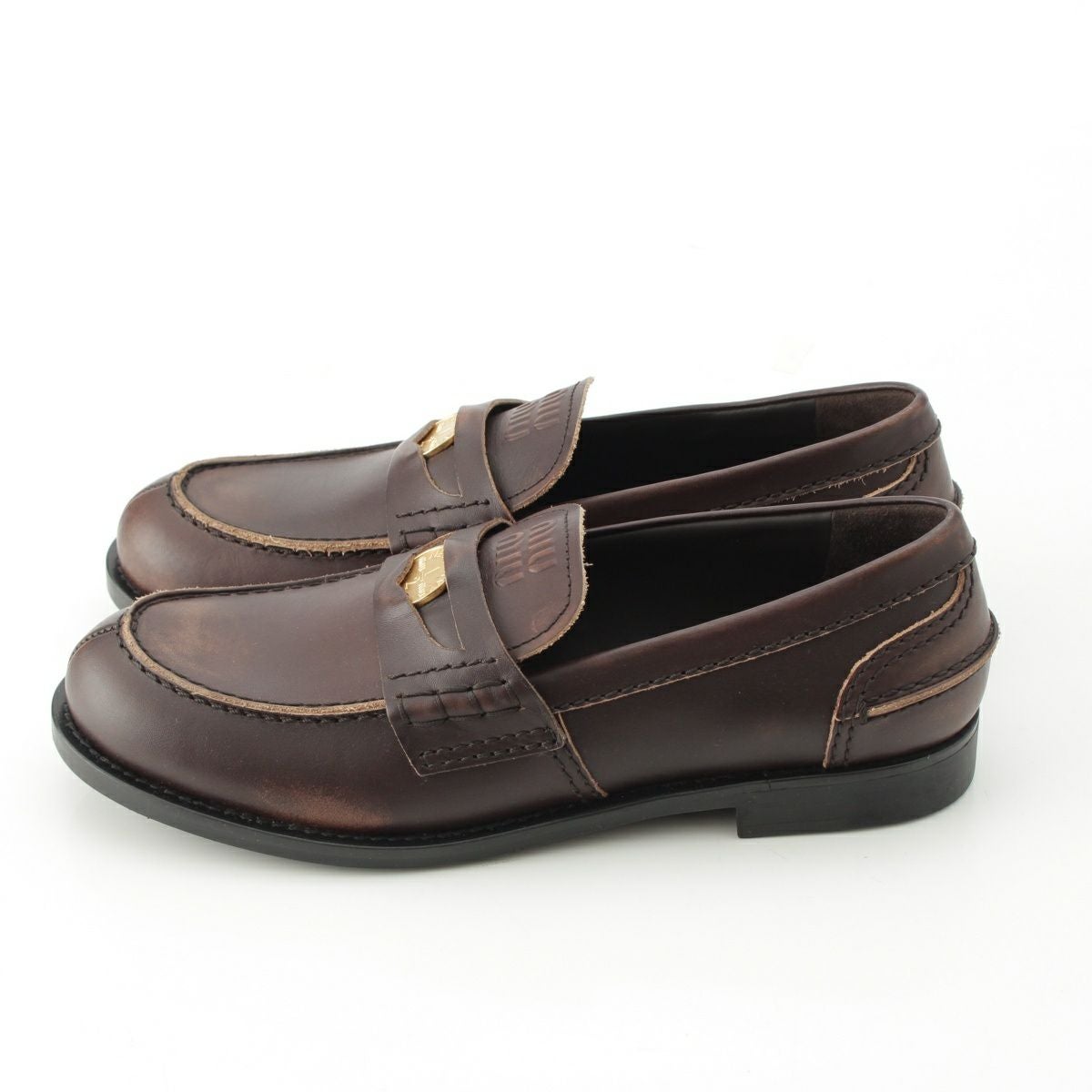 ミュウミュウ レザー ヴィンテージ加工 ペニー コイン ローファー シューズ ダークブラウン 38