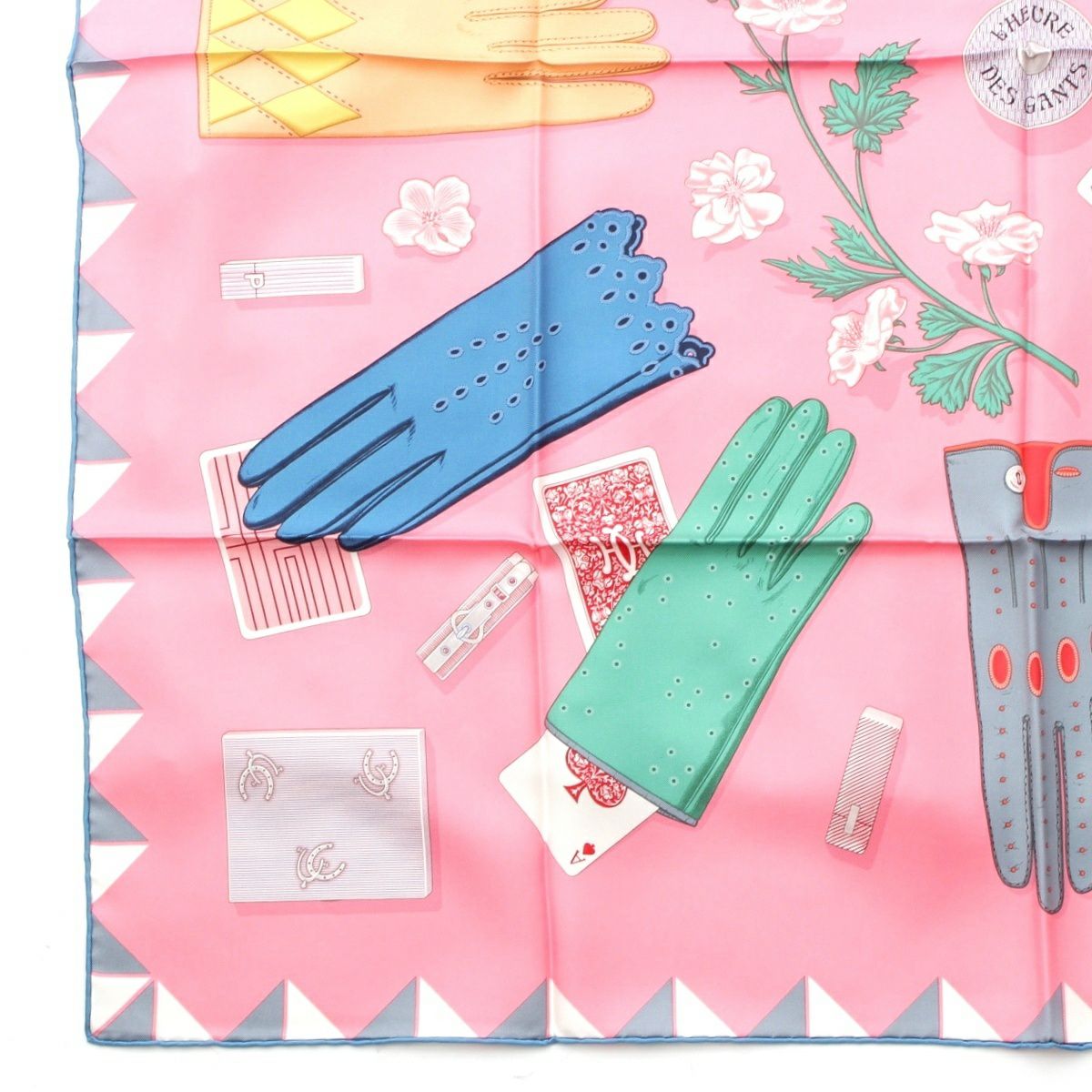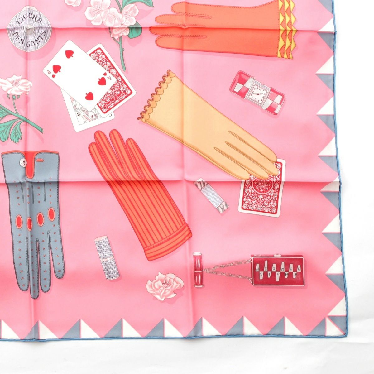 エルメス 25年 シルク カレ90 L'HEURE DES GANTS 手袋の時計 スカーフ ピンク