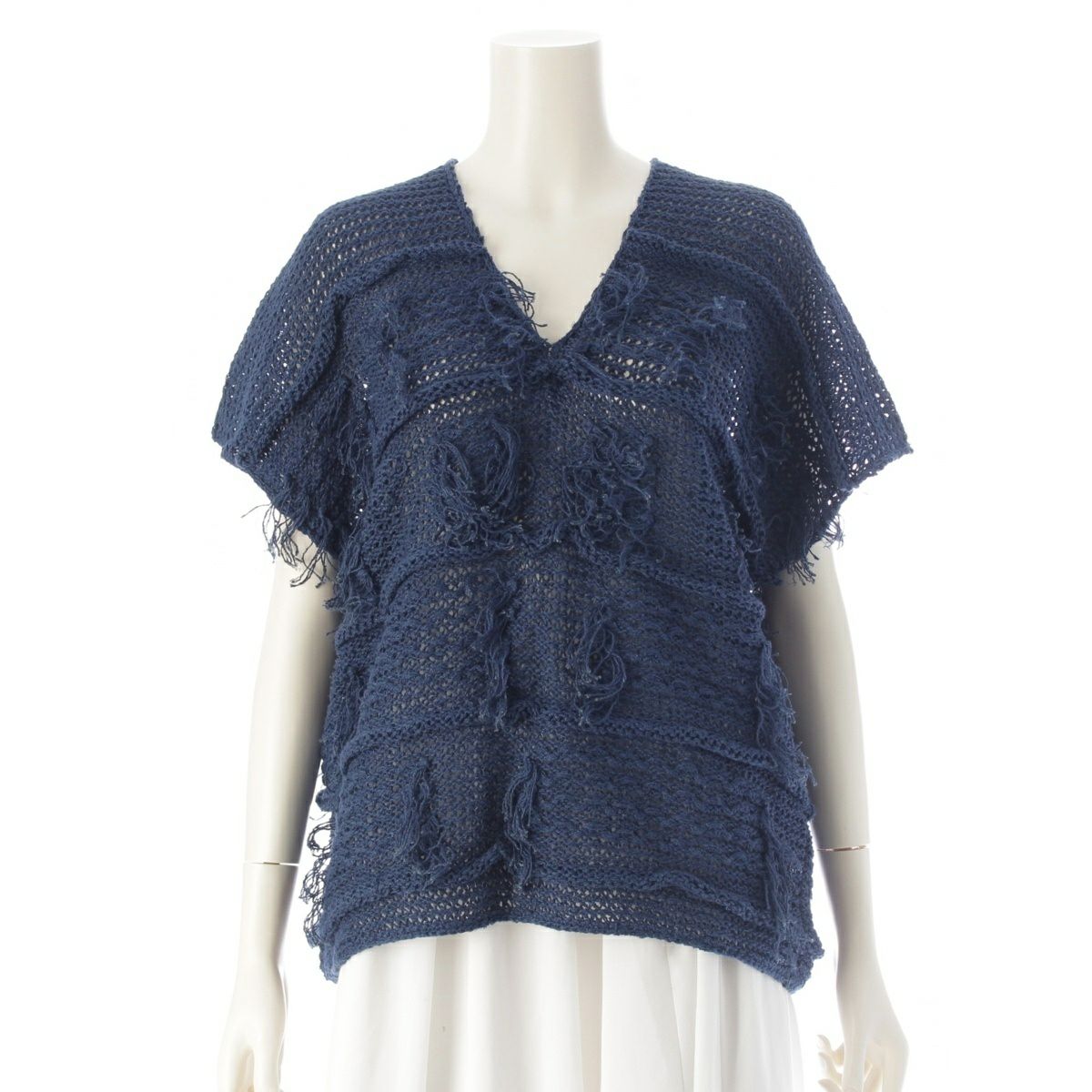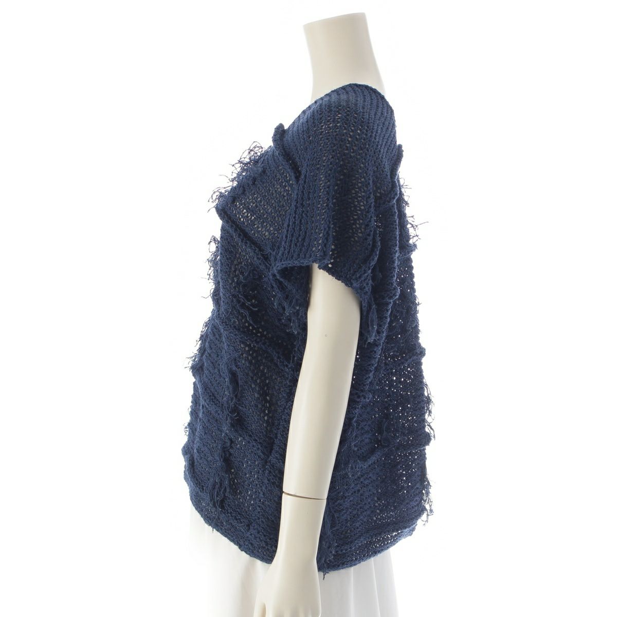 イッセイミヤケ 80s 1981年 麻 筆タグ ノースリーブ フリンジ 変形 トップス ニット ネイビー M