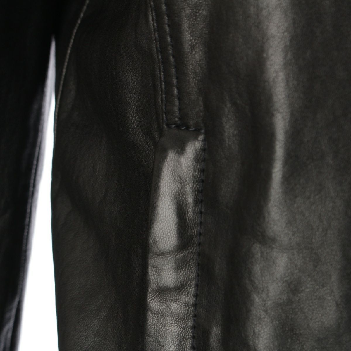 ダメージ箇所: 襟に型崩れ、裾、レザー内側(左)、左袖内側に汚れ、袖口、前立てに擦れ、ボタンにメッキがれ、くすみ、保管臭のようなニオイ