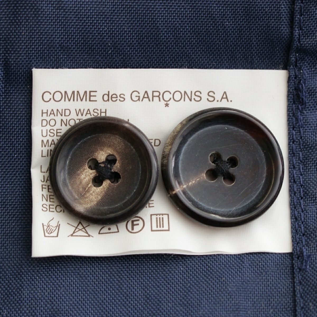 ダメージ箇所: 第一ボタンに縫製解れ、背面左上部に擦れ/毛羽立ち、保管臭のようなニオイ