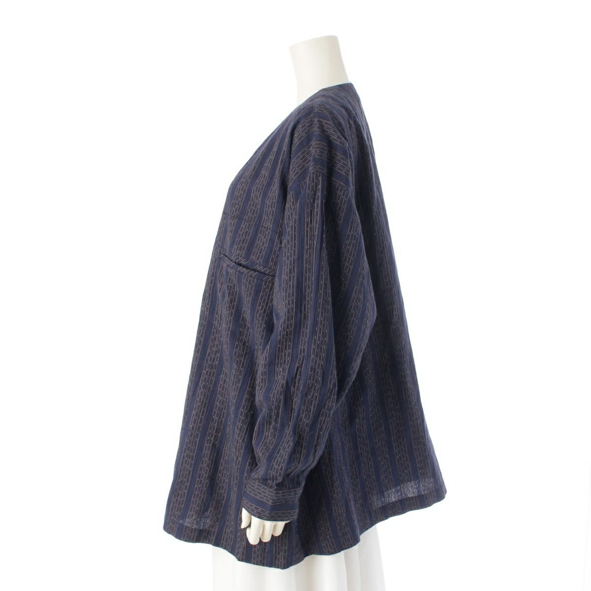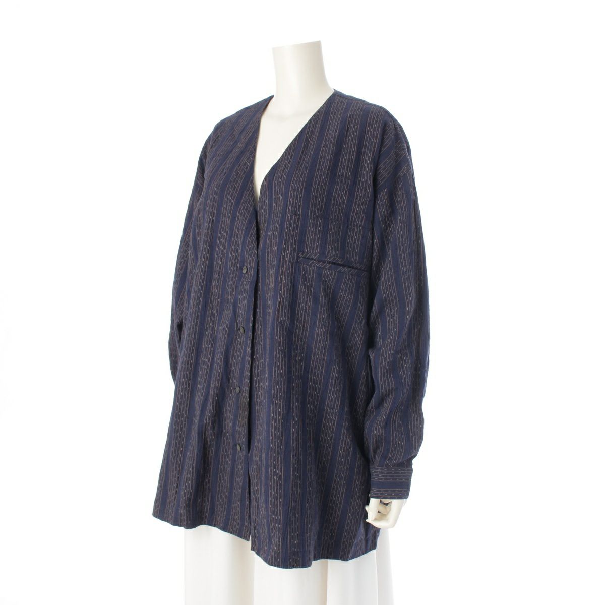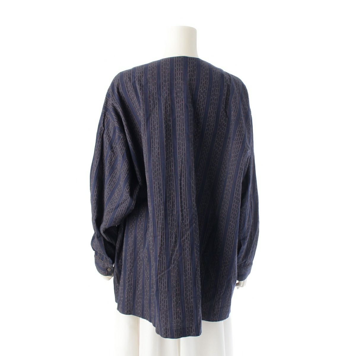 イッセイミヤケ 筆タグ 80s 1984年 両玉縁ポケット ノーカラー 絣 KASURI ストライプ 長袖シャツ ジャケット ネイビー M