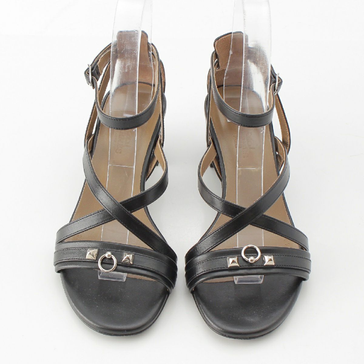 エルメス アンティネア レザー コリエドシアン スタッズ ストラップ ヒール サンダル ミュール 201059Z シルバー金具 ダークブラウン 37