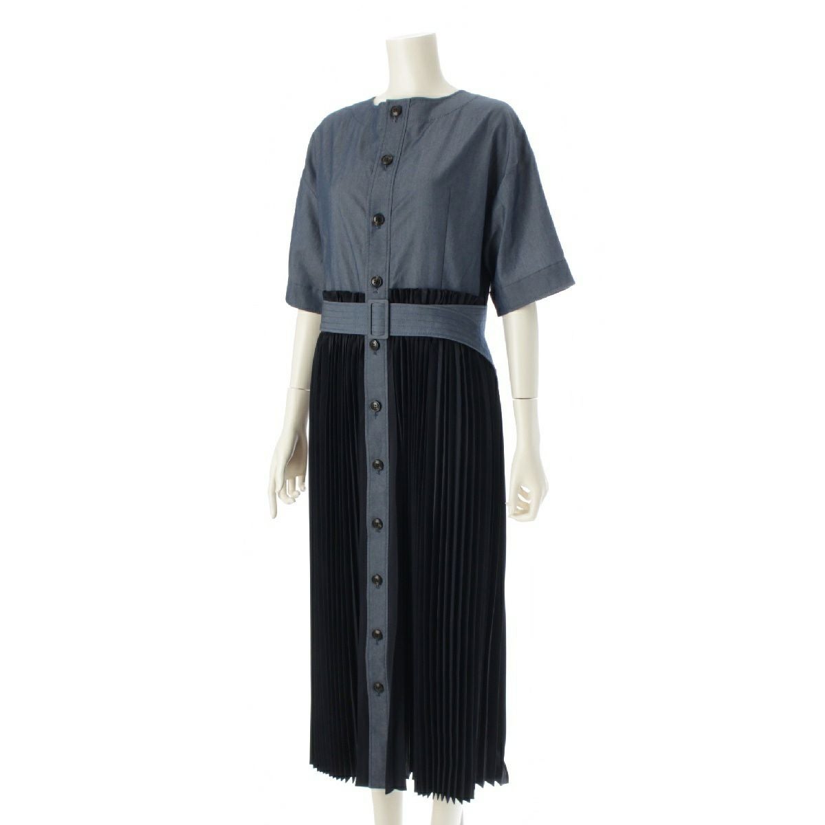 アドーア 23年 プリーツ ドッキング ベルト付 ロング ワンピース ドレス 531‐3140330 ブルー ネイビー 38