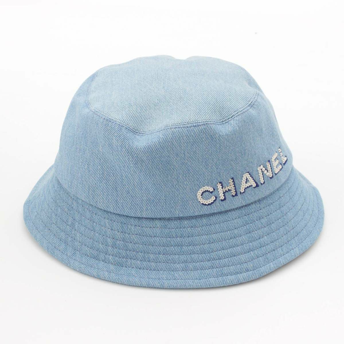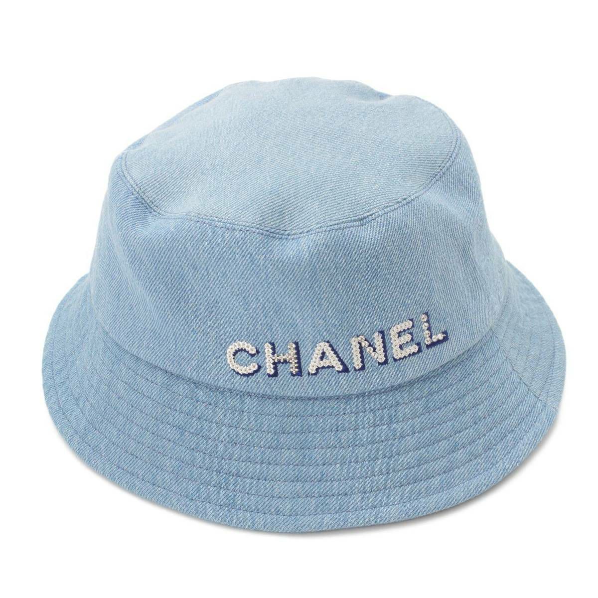 シャネル ロゴ スパンコール 刺繍 デニム バケットハット 帽子 ブルー M