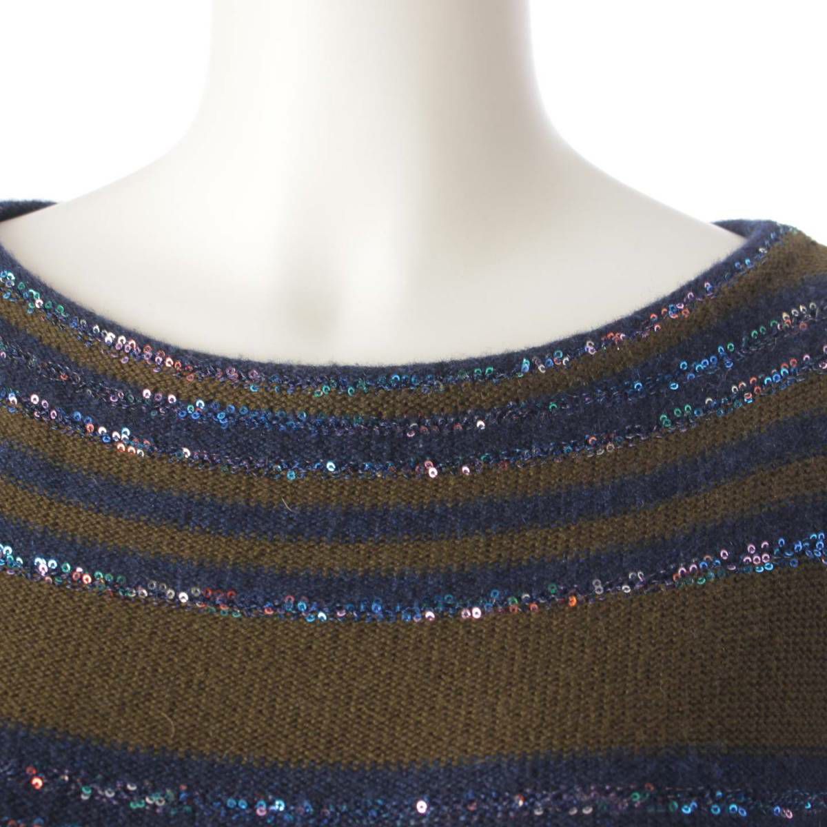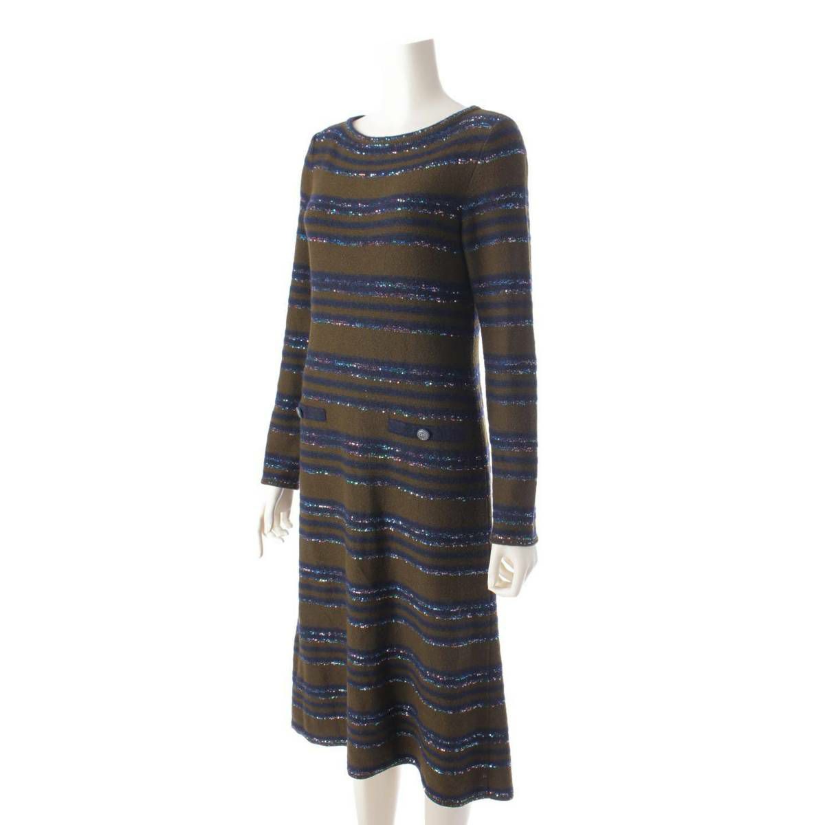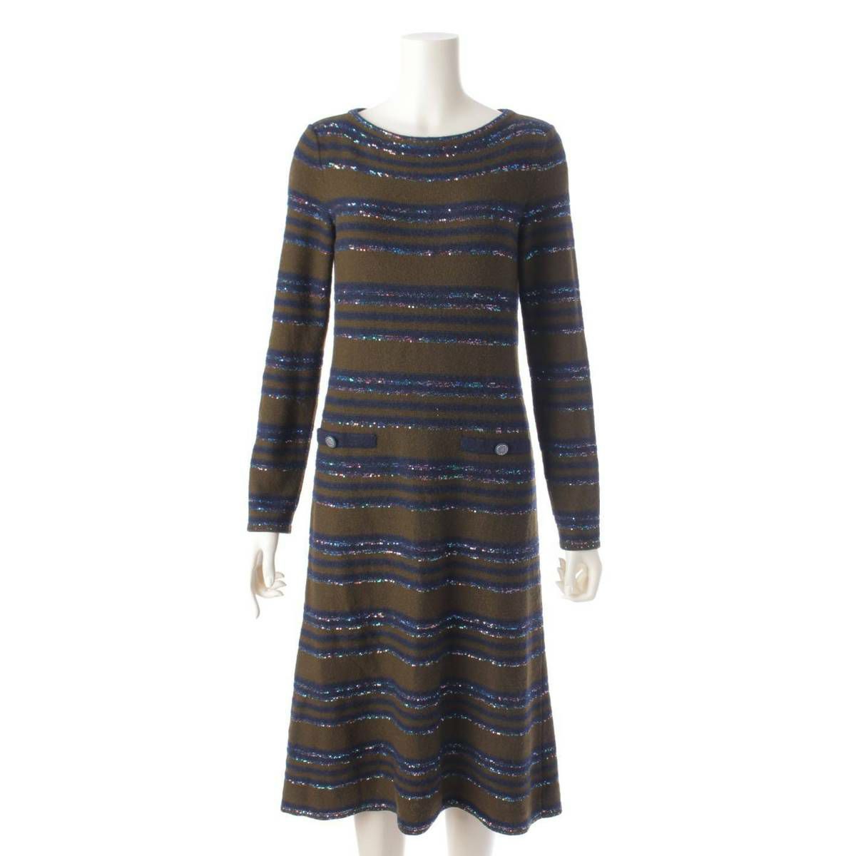 シャネル カシミヤ スパンコール 長袖 ニットワンピース P62936 カーキ×ネイビー 36