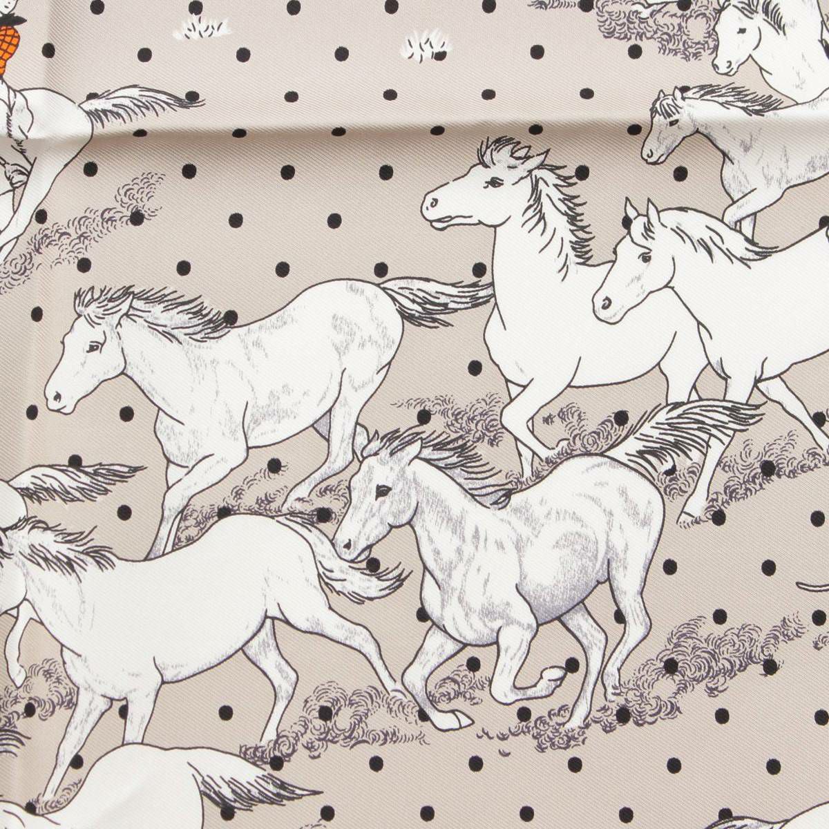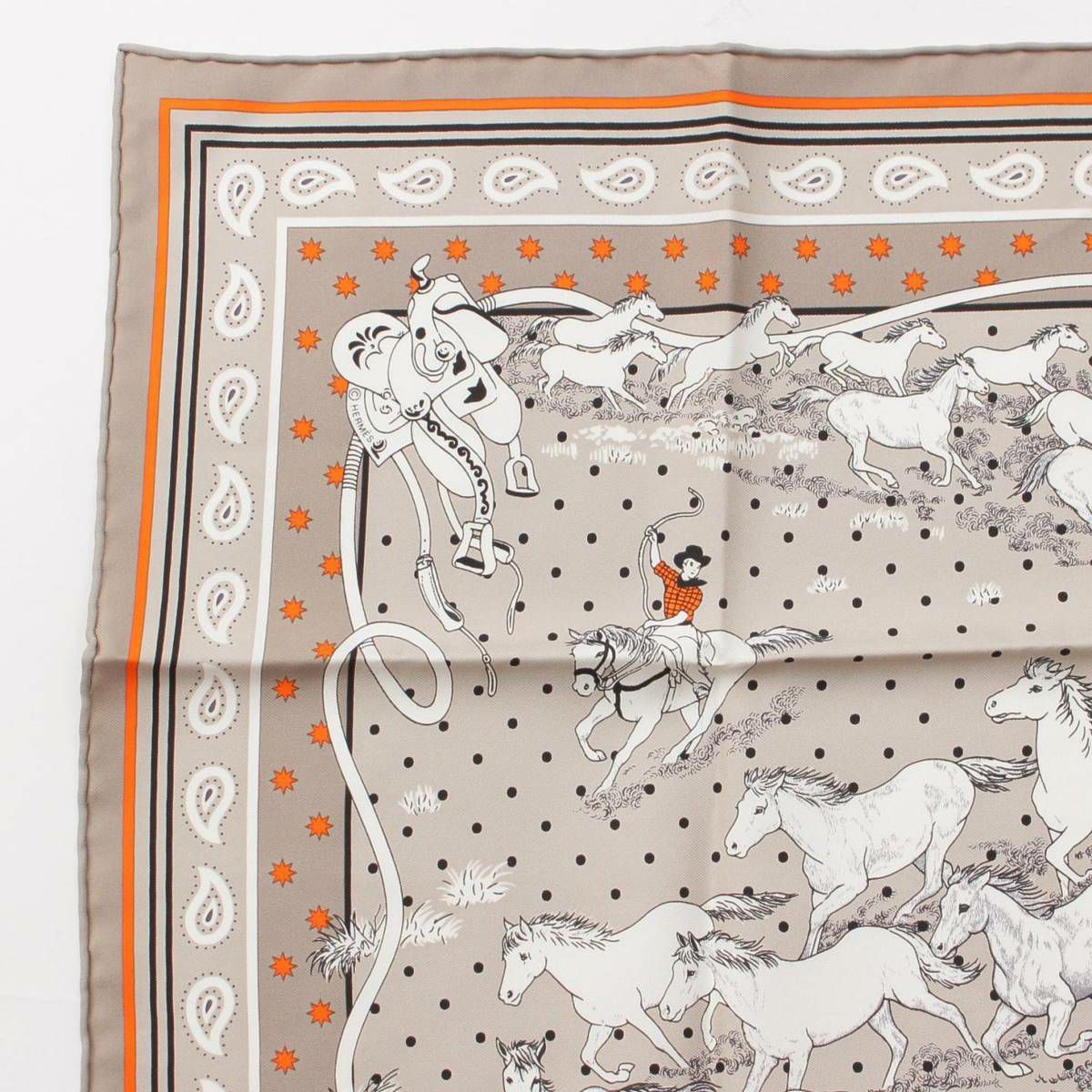 エルメス カレ55 シルク スカーフ Les Mustangs Bandana 野生馬 オレンジ ×グレー