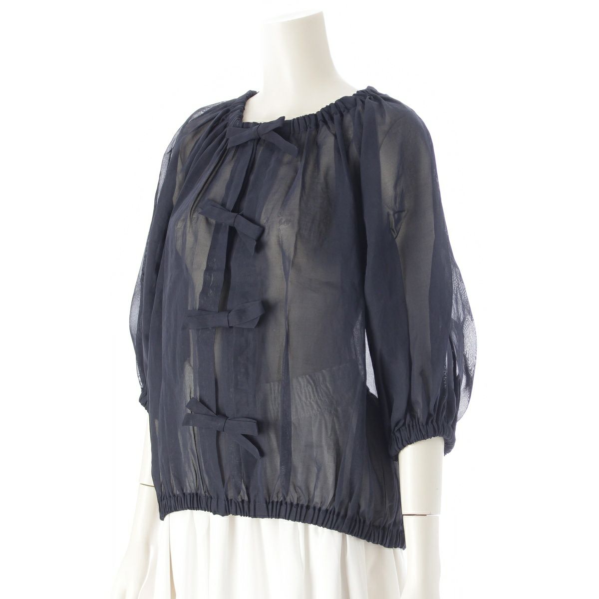 ティーマットマサキパリ コットン ドゥロワー別注 フロントリボン バルーンスリーブ シアー ブラウス トップス ネイビー 1