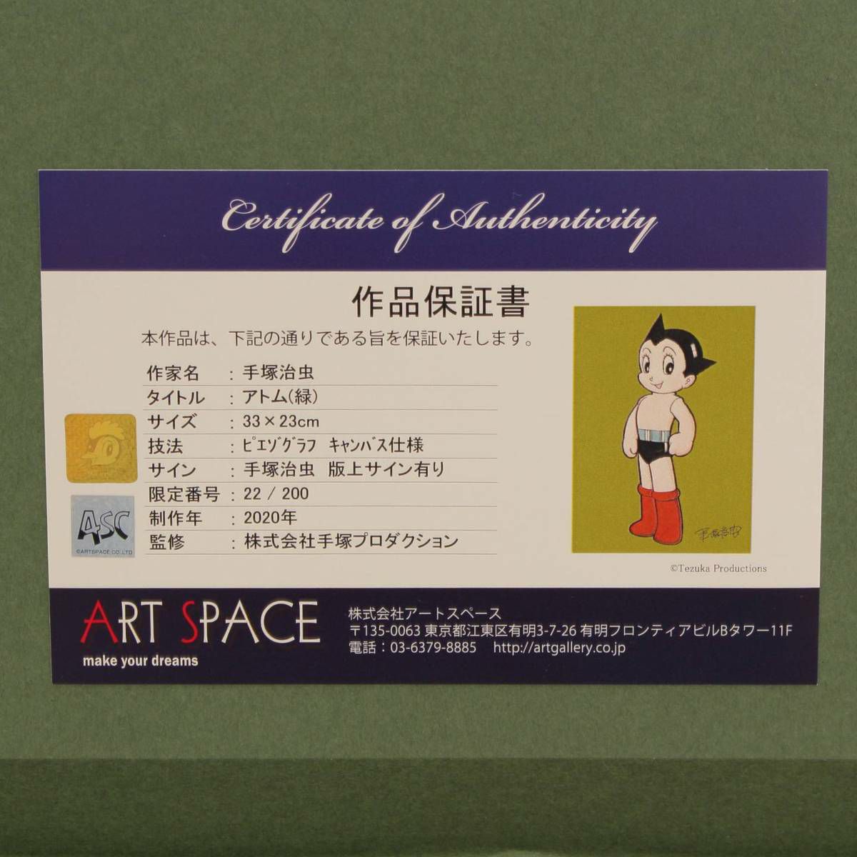 その手塚氏の代表作にして世界的人気作「鉄腕アトム」を芸術作品として300前限定のピエゾグラフで作品化。(株)手塚プロダクションの公式作品として「作品保証書」も付いています。盤面には手塚氏のサインを特殊加工で再現、バックのモスグリーンと相まって、今にもアトムが動き出しそうな貴重な作品です。