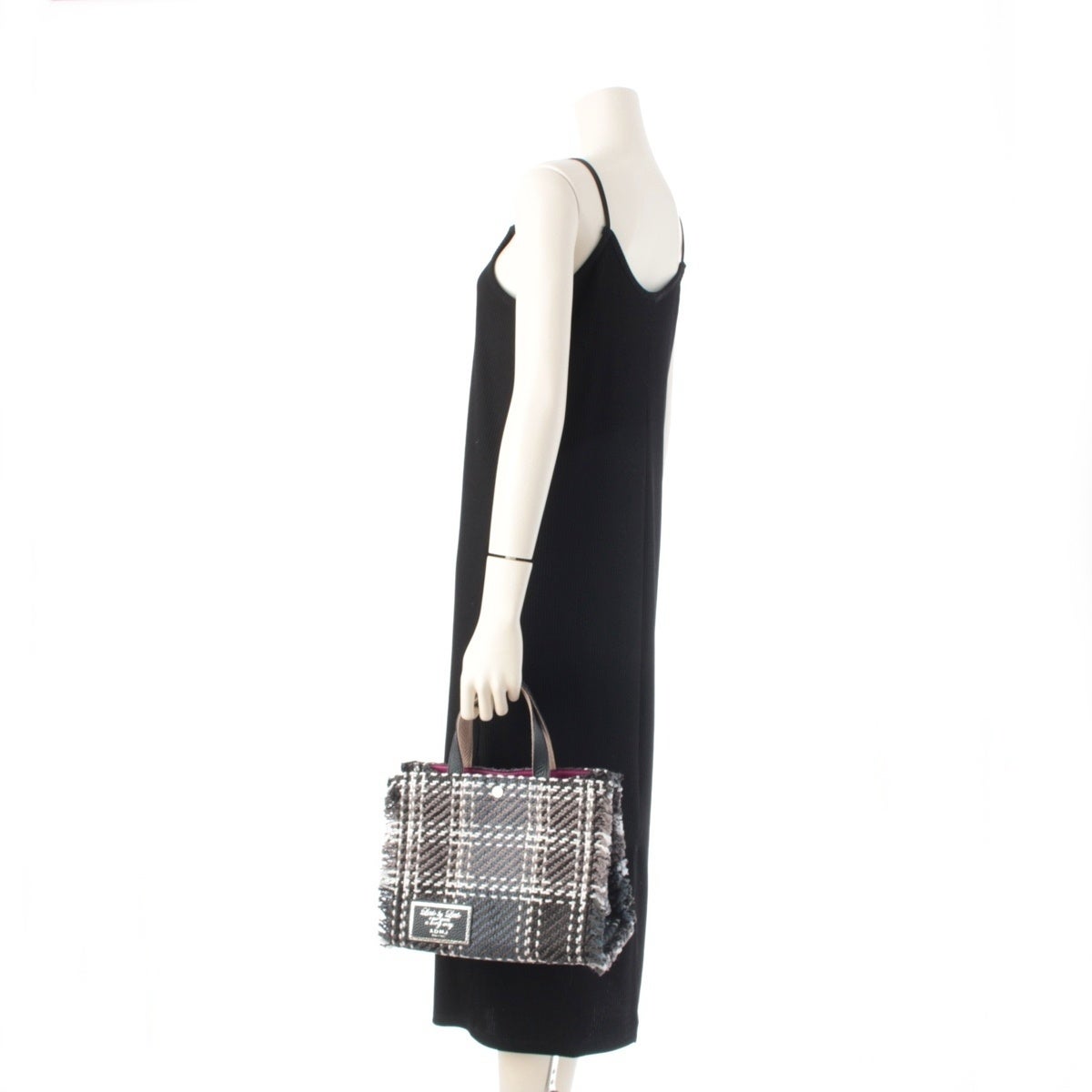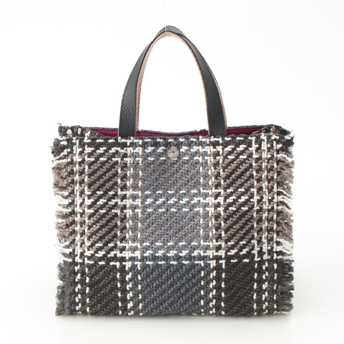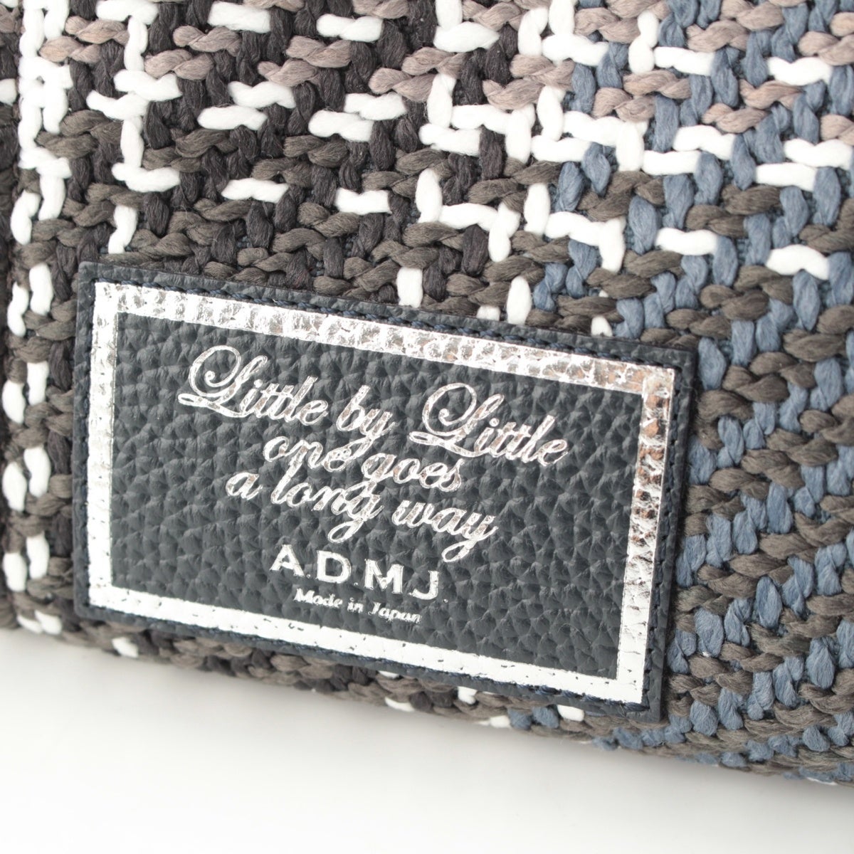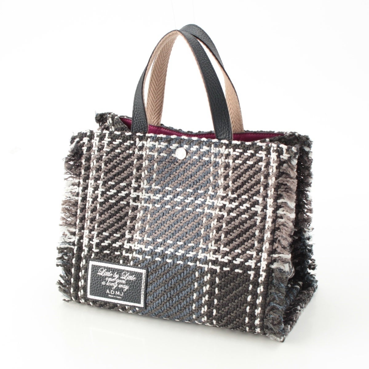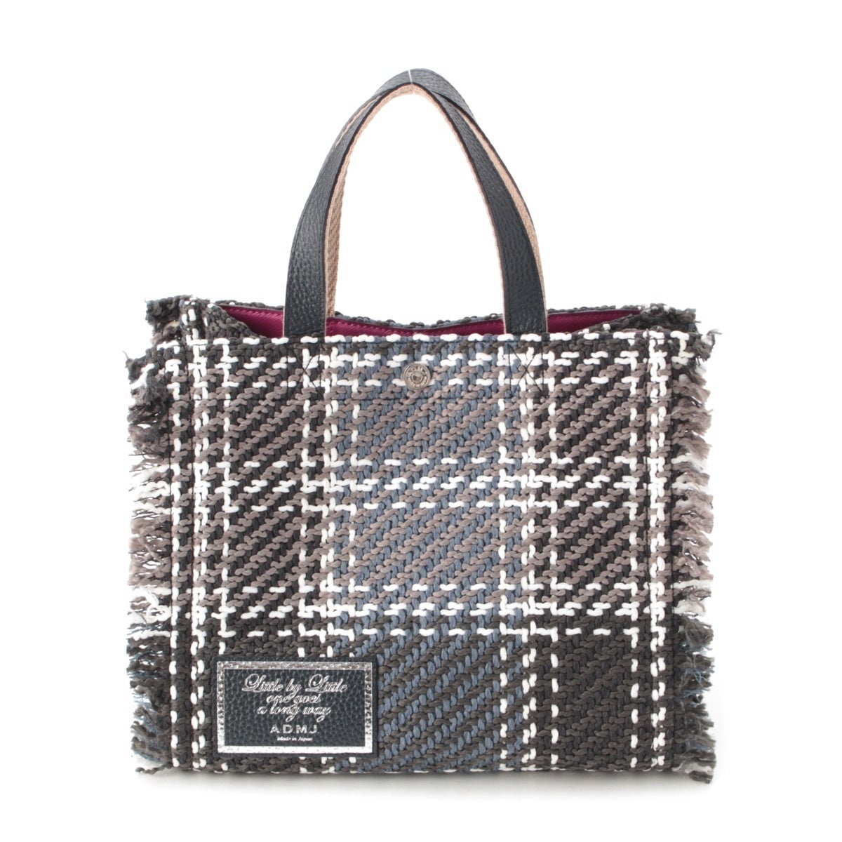 エーディーエムジェイ ツイードツイル フリンジ チェック トート ハンドバッグ ネイビー グレー
