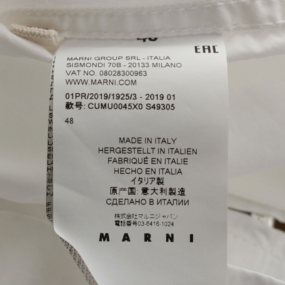 マルニ 19SS コットン ジップアップ ベースボール 半袖シャツ トップス CUMU0045X0 ホワイト 48