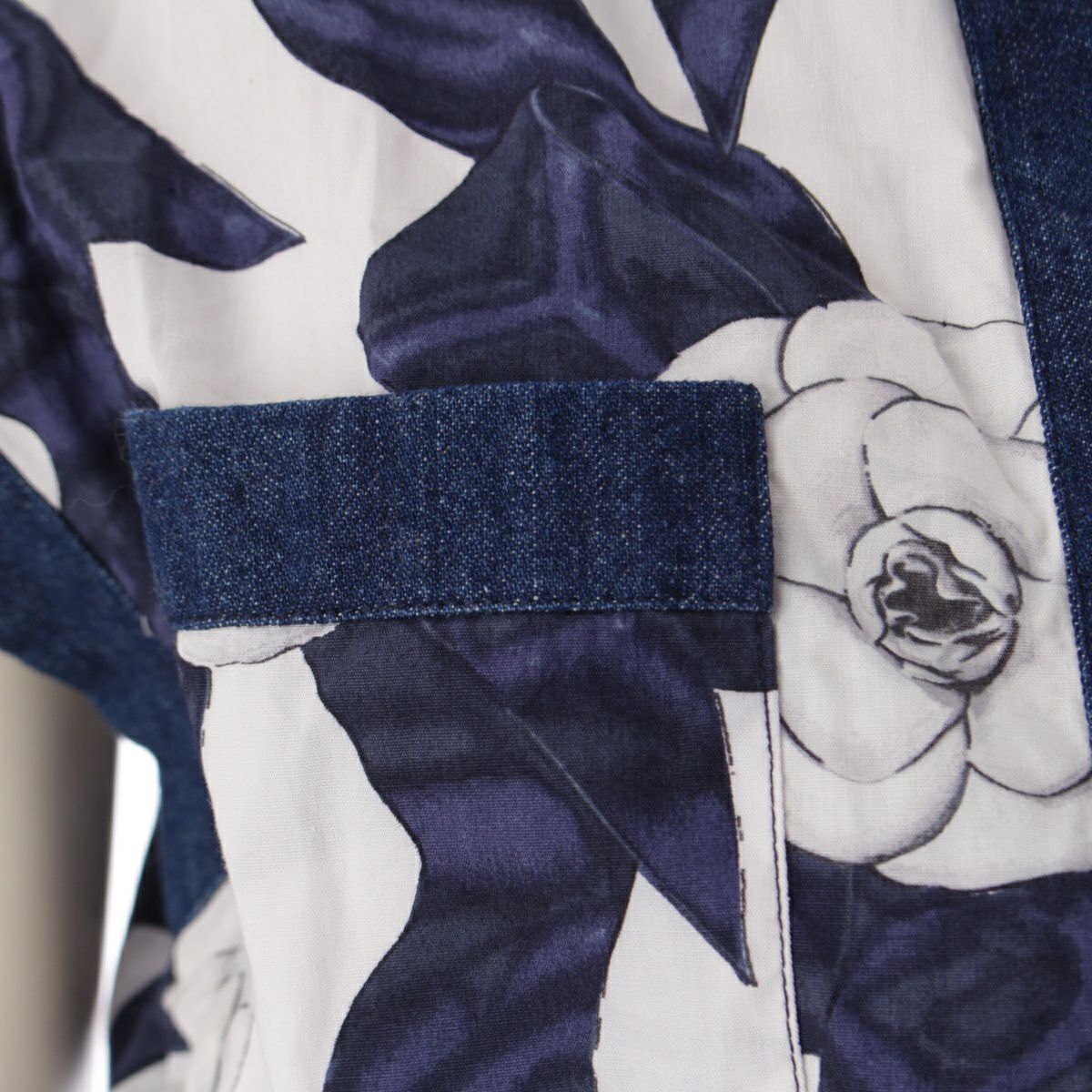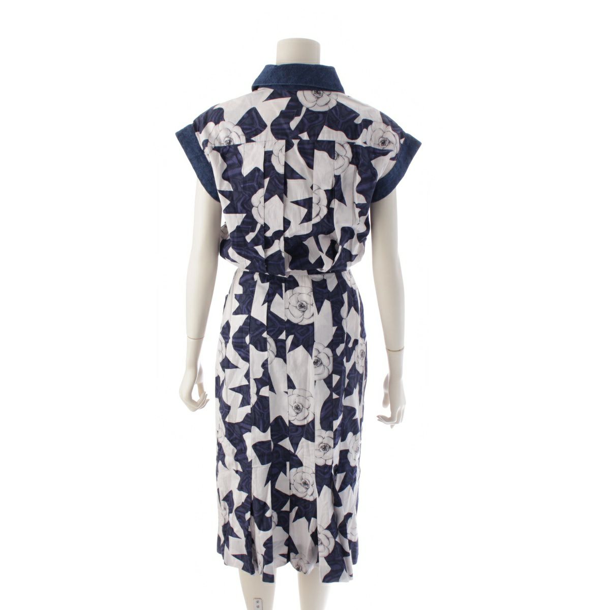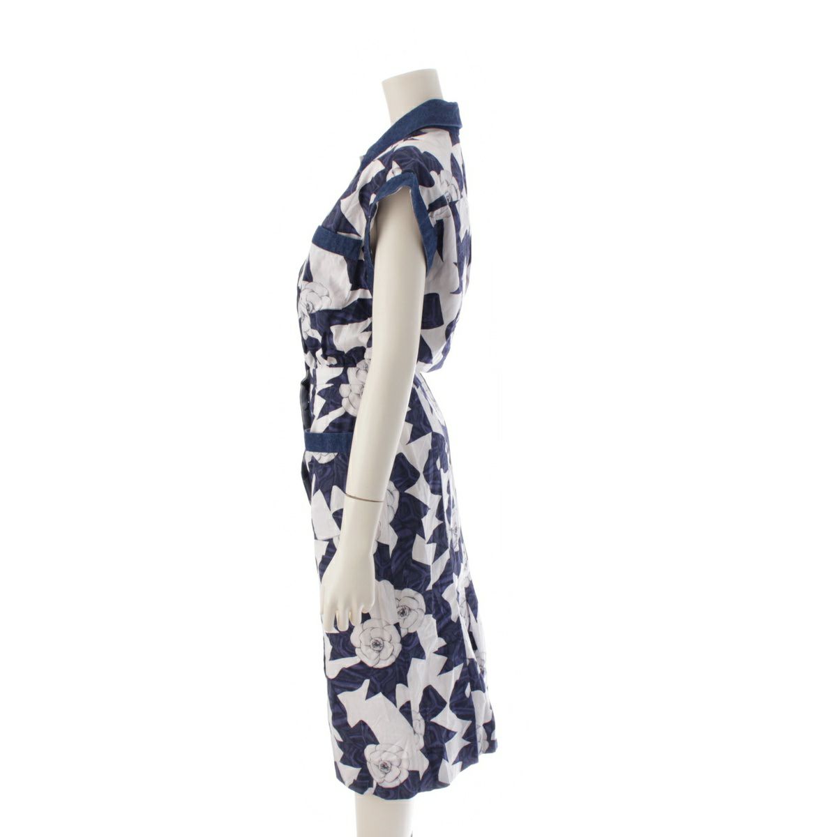 シャネル 87年 コットン ヴィンテージ カメリアリボン柄 ココマークボタン ワンピース デニム切り替え ドレス ホワイト ブルー系