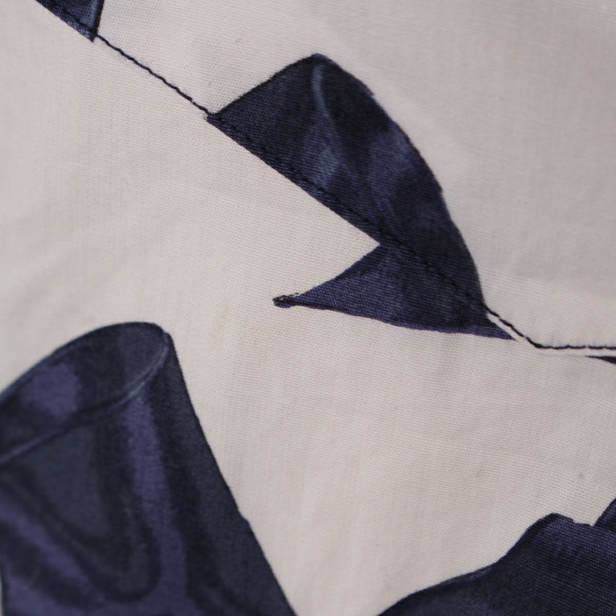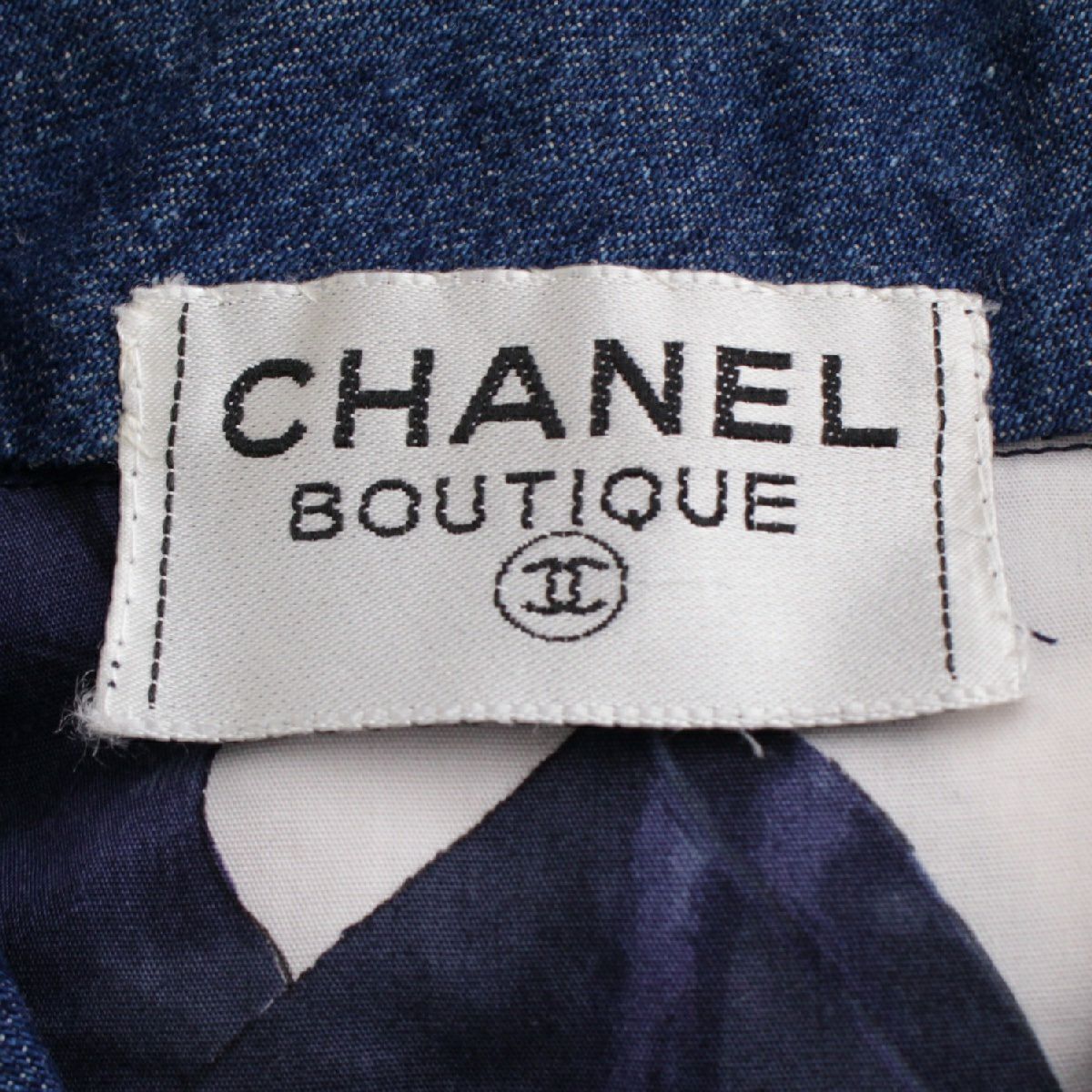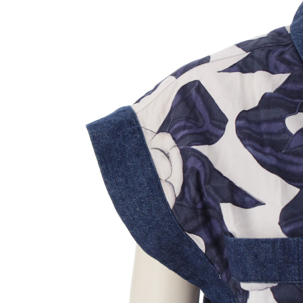 シャネル 87年 コットン ヴィンテージ カメリアリボン柄 ココマークボタン ワンピース デニム切り替え ドレス ホワイト ブルー系