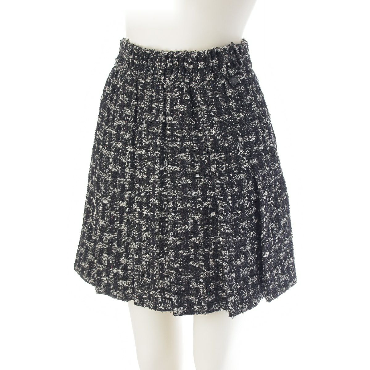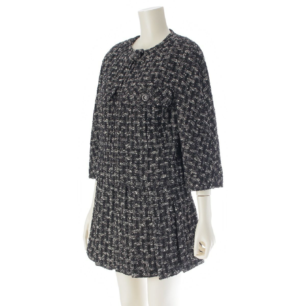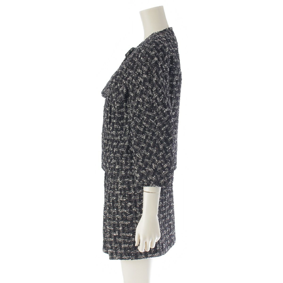 シャネル ウール ツイード ジップアップ ジャケット プリーツ スカートセットアップ ノーカラー 7分袖 ミニ丈 P46659/P46707 ブラック 34