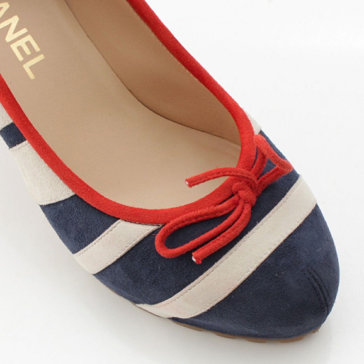 シャネル スエード マリンボーダー柄 ココマーク リボン ヒール パンプス G25896 ネイビー ホワイト 37