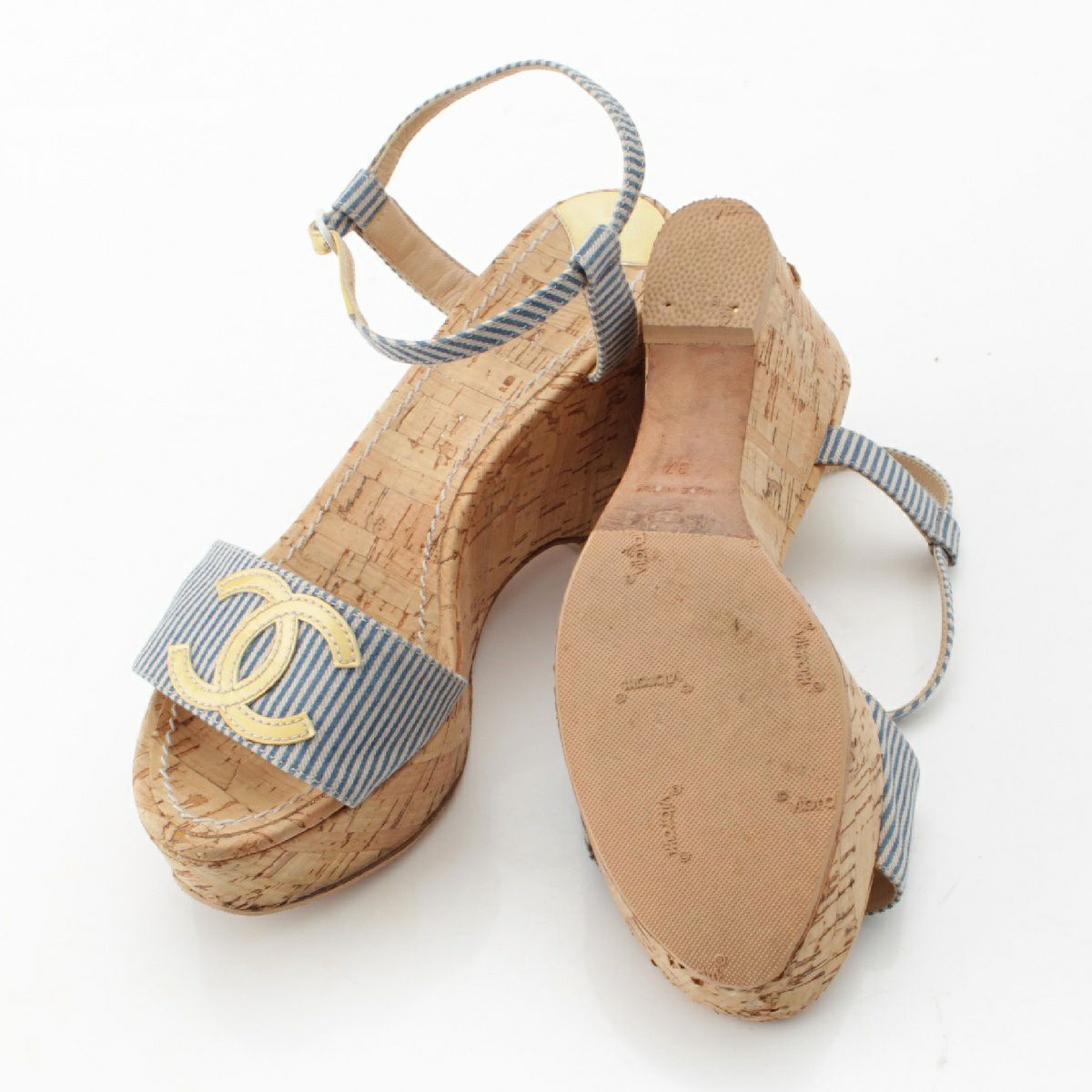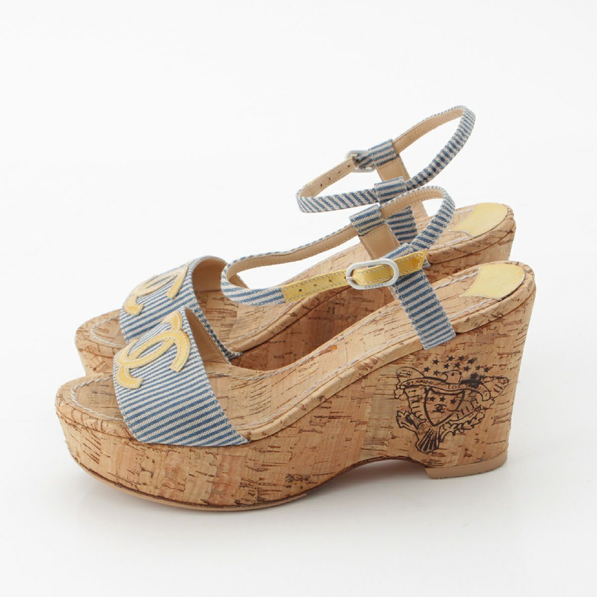 シャネル ココマーク ストライプ ウェッジソール サンダル G25915 ブルー 37