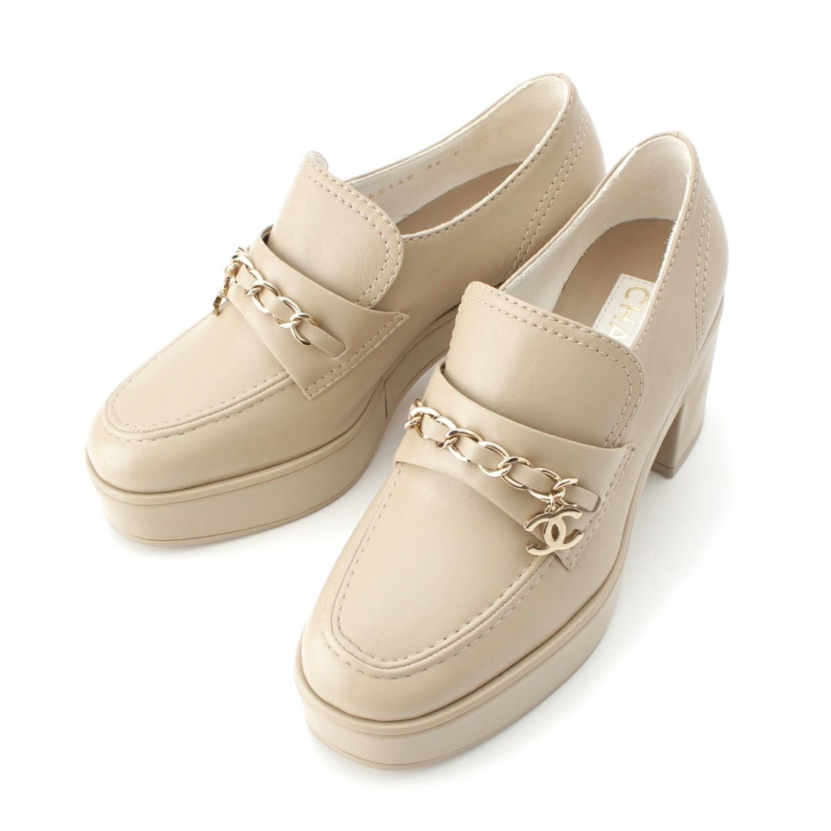 シャネル 23B レザー ココマーク ヒール ローファー シューズ G45142 ベージュ 36
