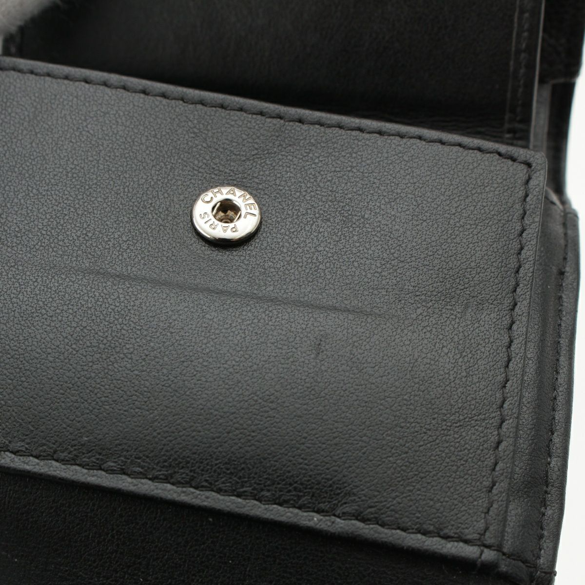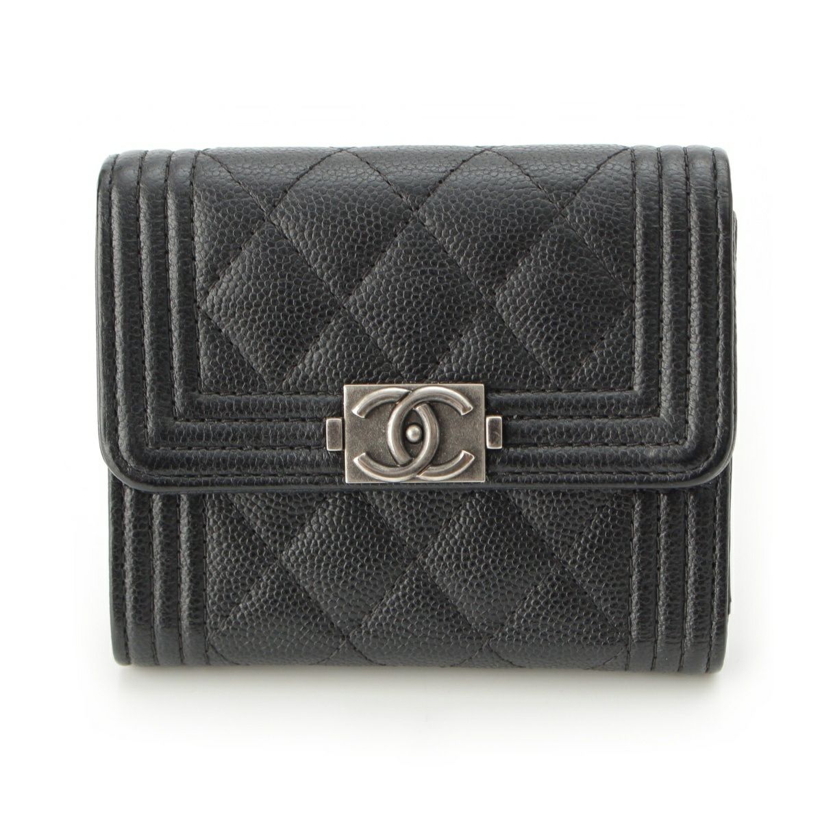 シャネル 25番台 ボーイシャネル キャビアスキン ココマーク 三つ折り財布 スモール フラップ エイジングシルバー金具 A84432 ブラック