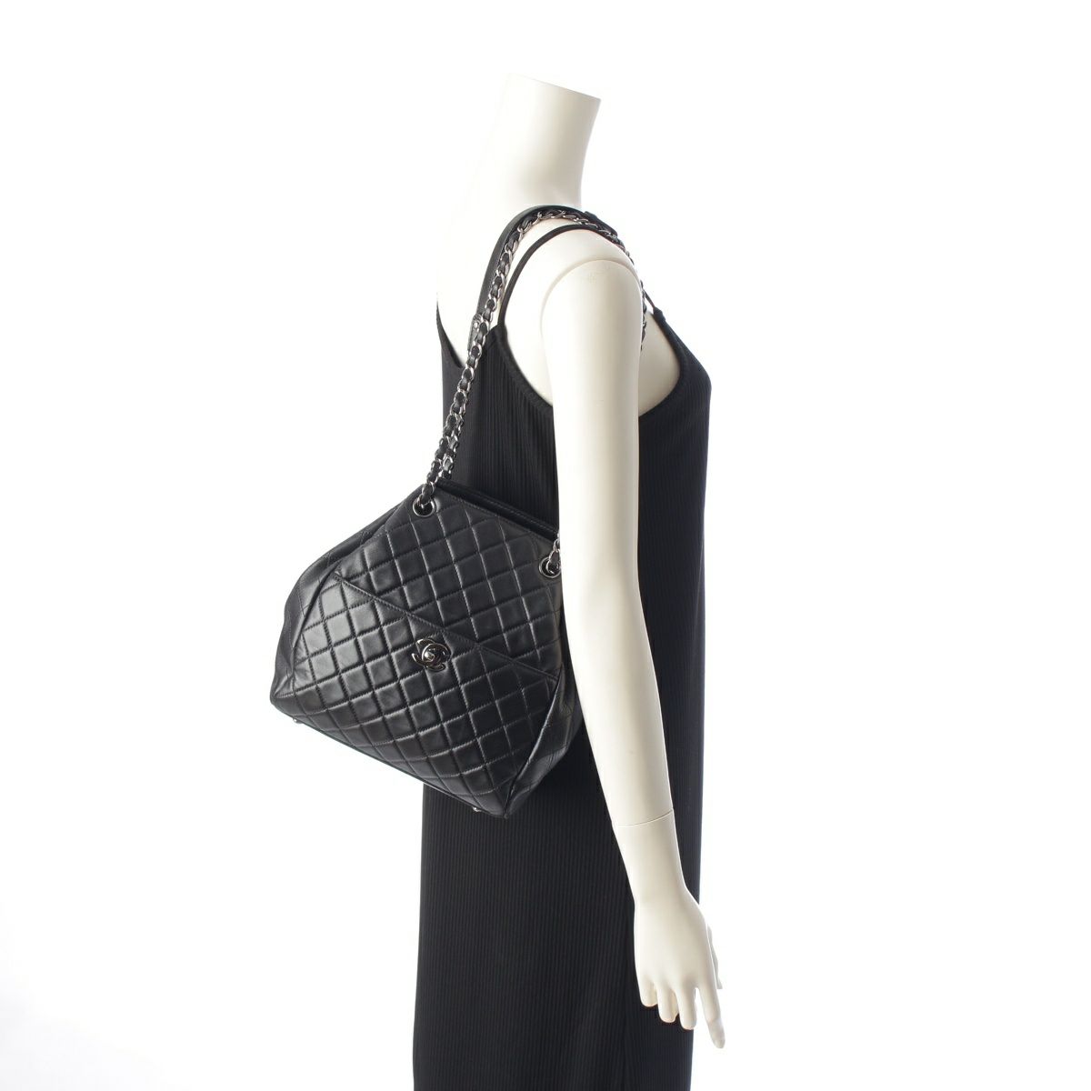 シャネル 23番台 ラムスキン マトラッセ 巾着 シルバー金具 チェーン バケット ショルダーバッグ ブラック