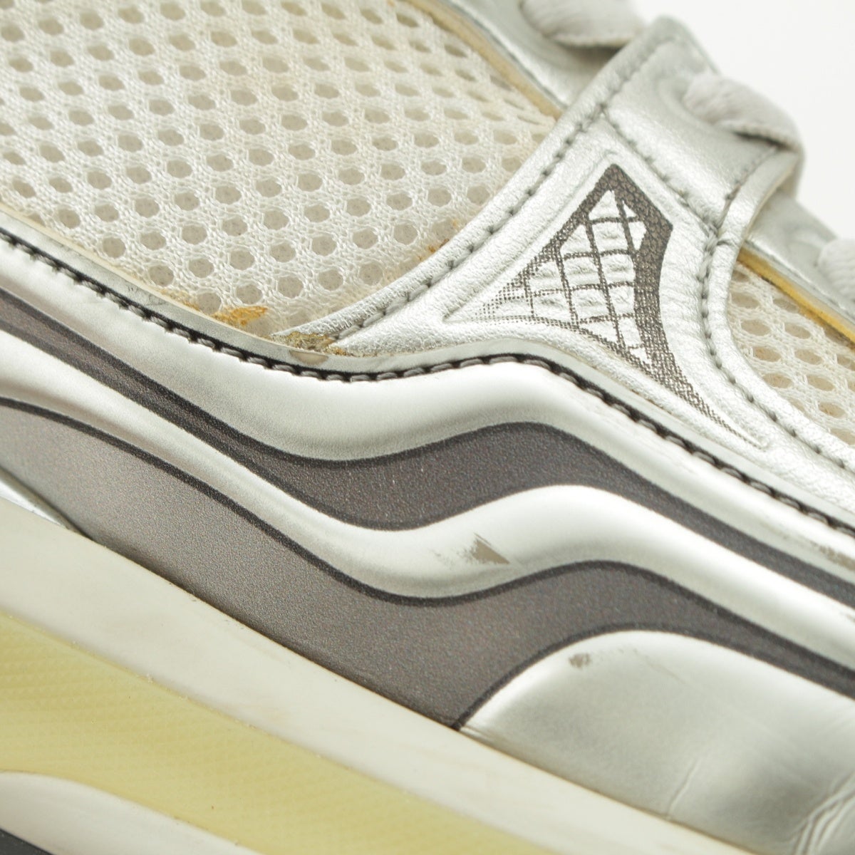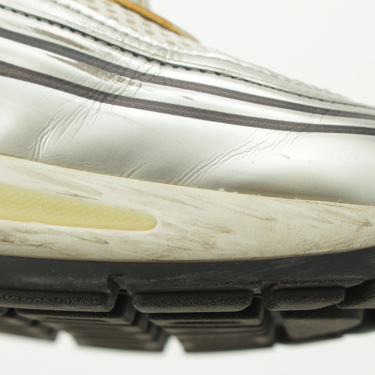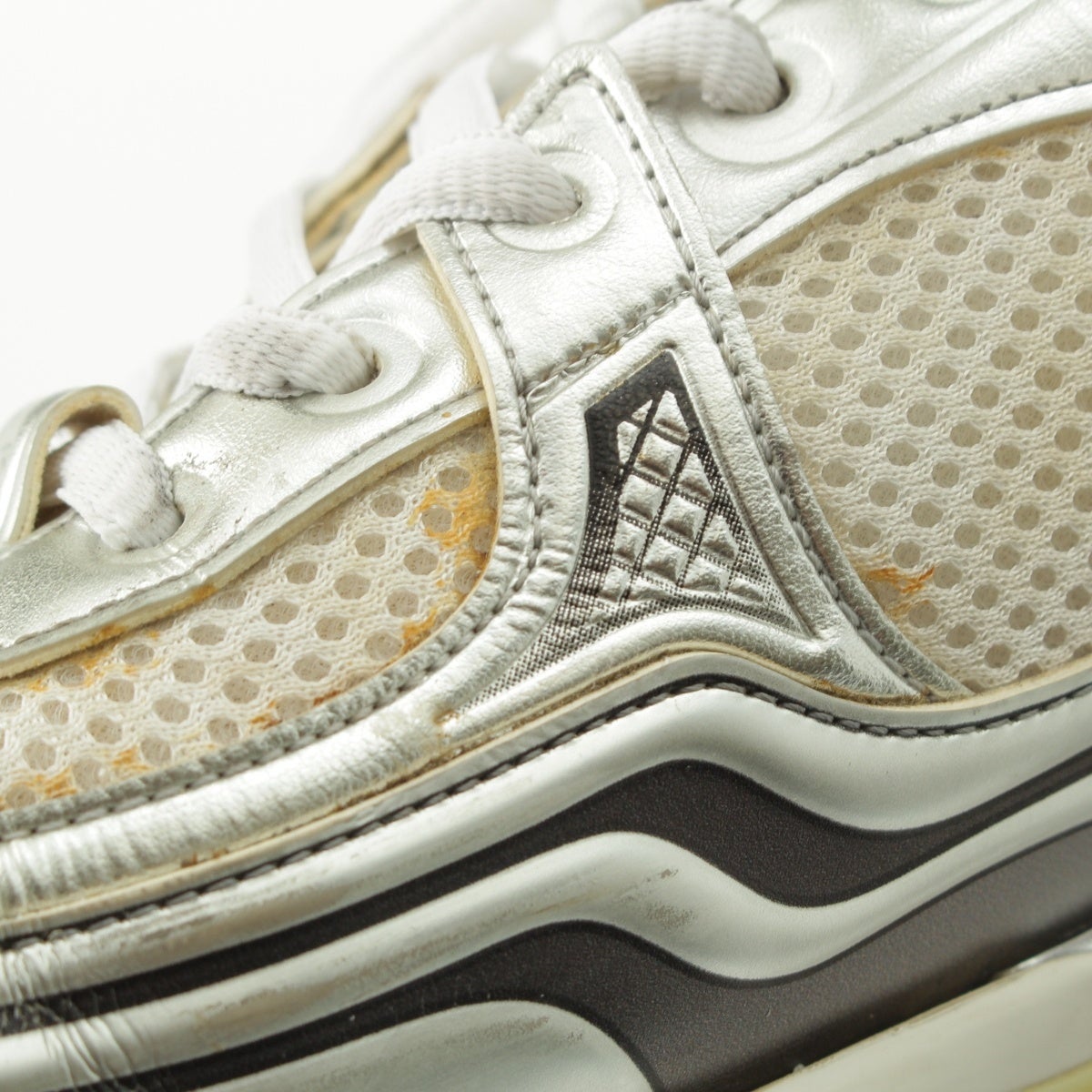 ダメージ箇所: アッパーソールに汚れ/擦れ/傷、シューレースに汚れ、アウトソールに汚れ/擦れ/傷、保管臭のようなニオイ
