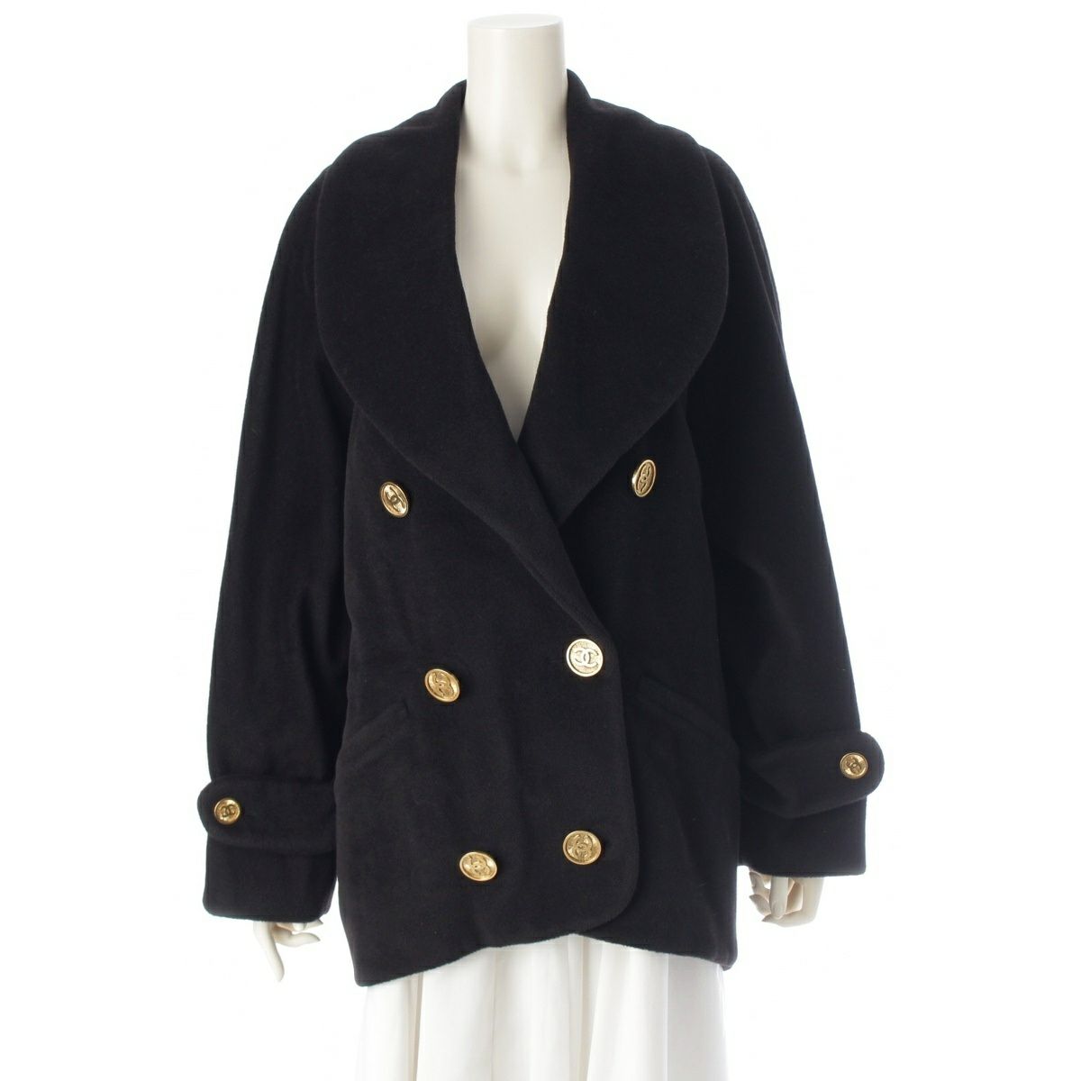 シャネル ウール ヴィンテージ 金ボタン ショールカラー ボリューム オーバー コート アウター 25328 ブラック 36