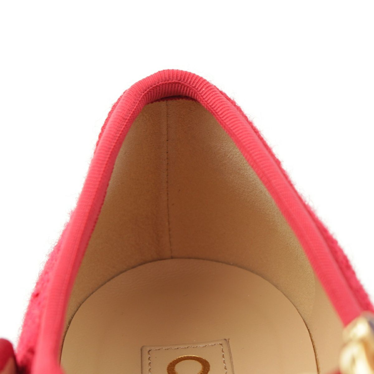 ダメージ箇所: アウトソール、インソール、裏地に汚れ/擦れ/シワ、アッパーサイドにシワ、ビジュー、金具等に傷、