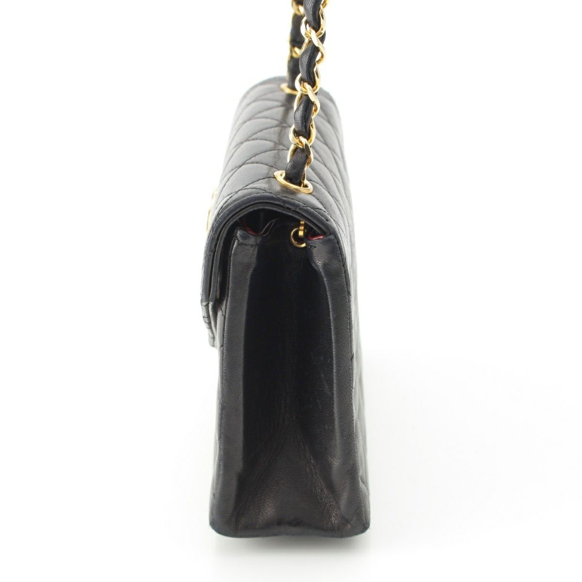 ダメージ箇所: 角、ストラップレザーに擦れ、金具に擦れ/傷、背面上部、底面等に汚れ、フラップ根本、マチに傷/シワ、