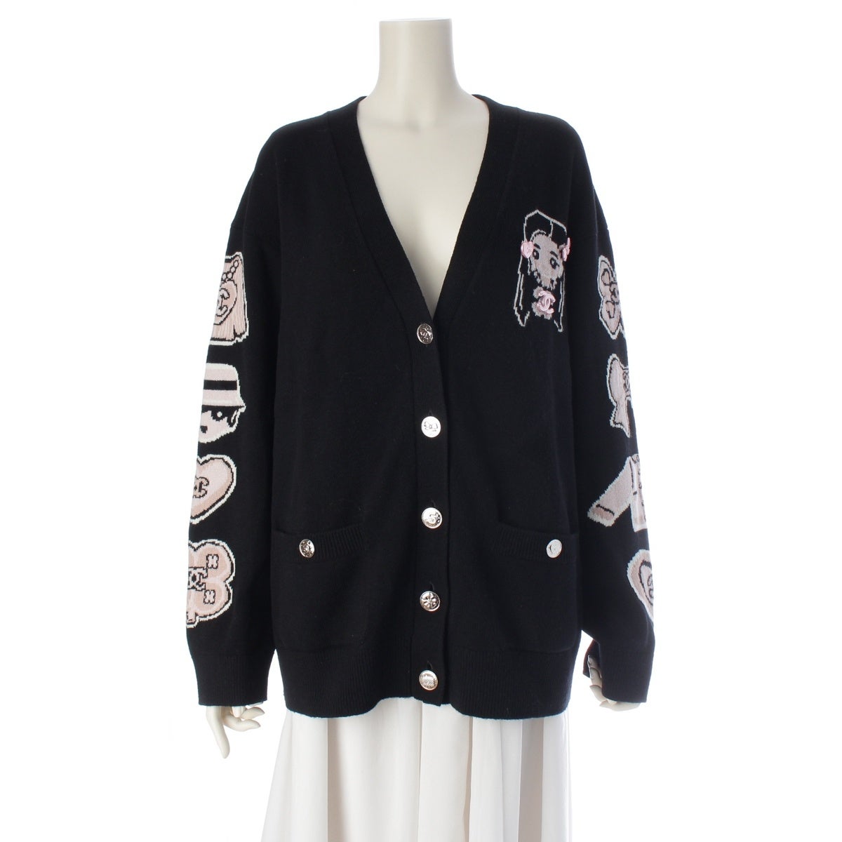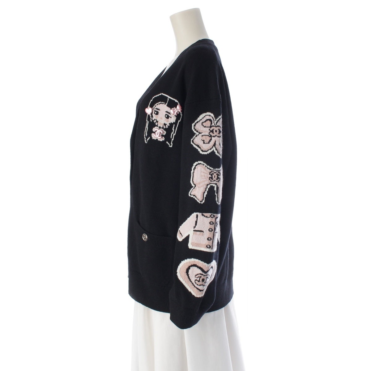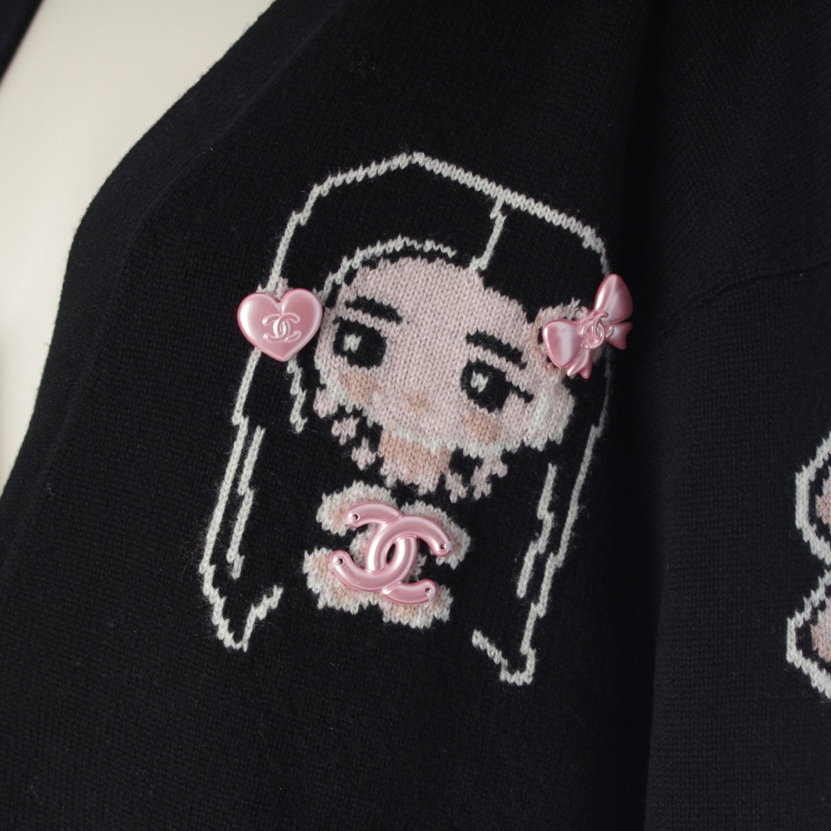シャネル 2025-26AW LOOK49 カシミヤ キャラクタープリント アイコン カーディガン P80231 ブラック×ピンク 38