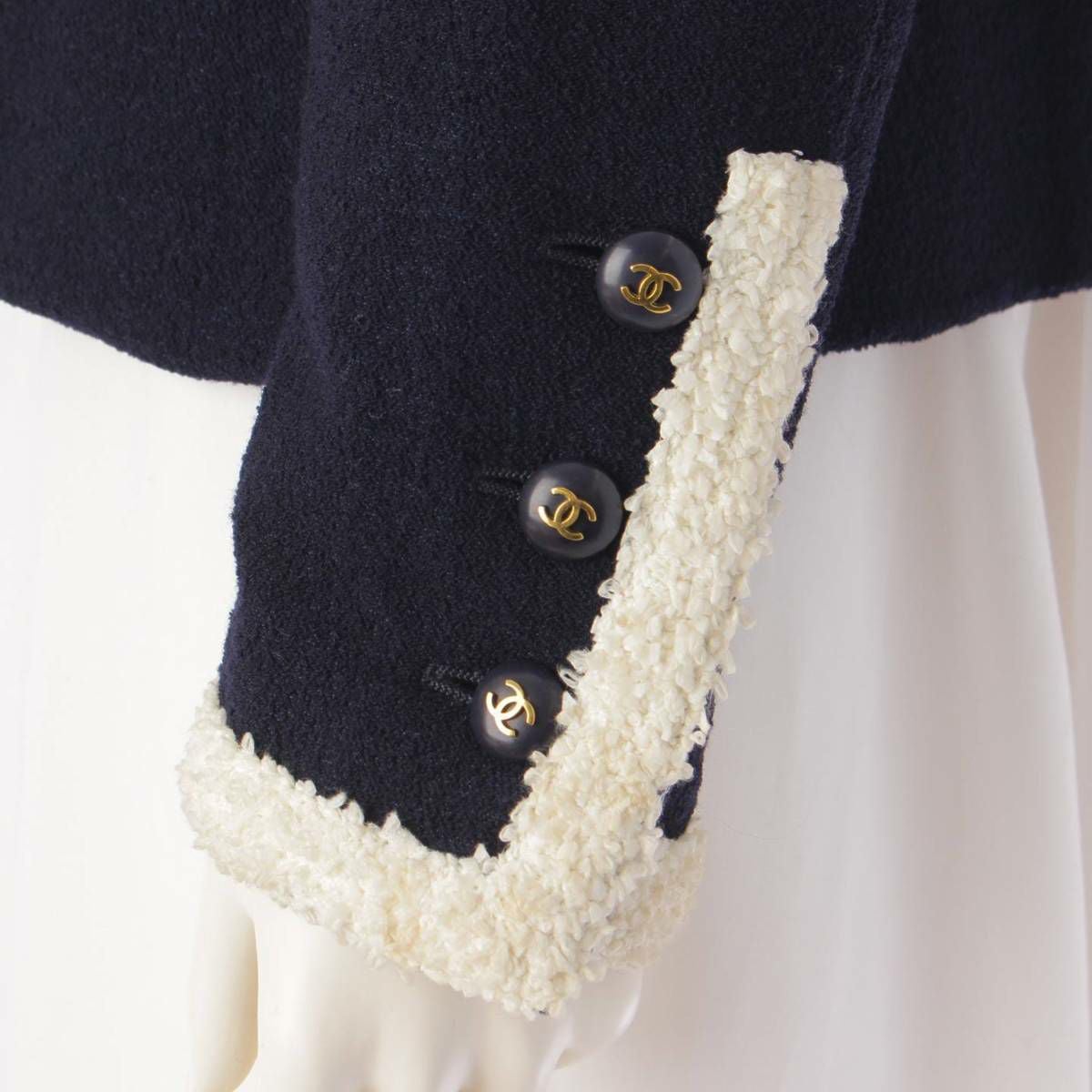 シャネル Chanel 95C トリミング ツイード ココボタン ノーカラー ジャケット ネイビー 38