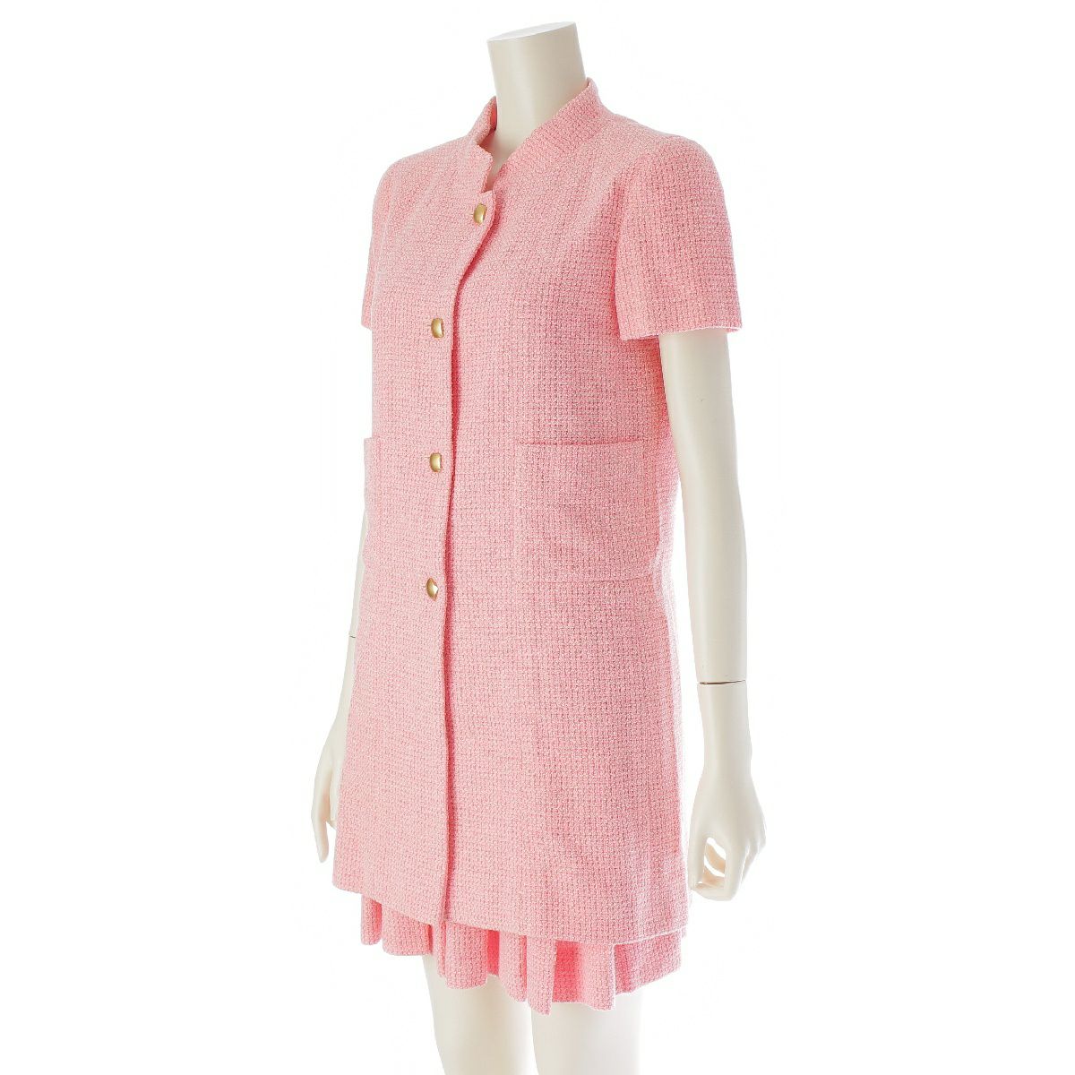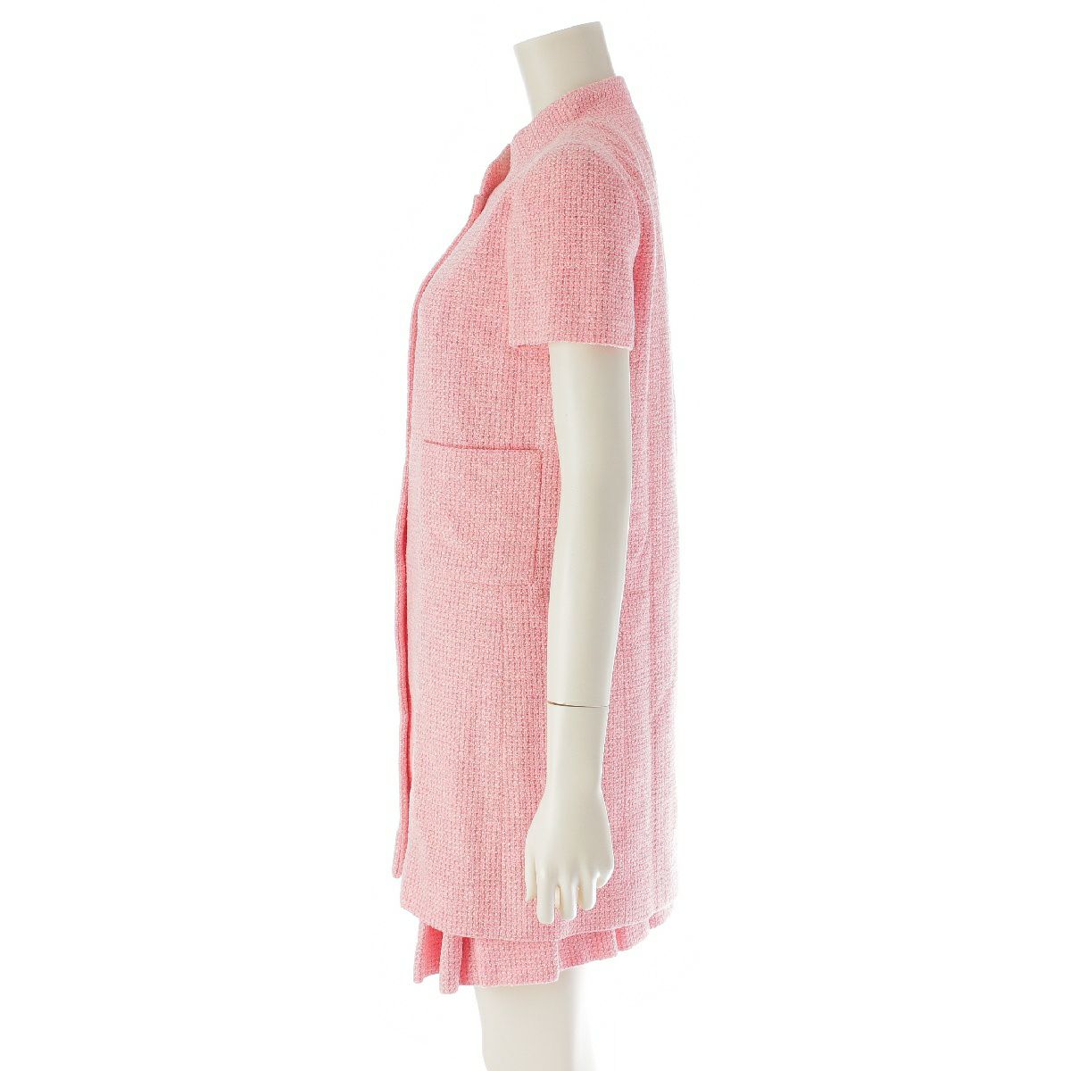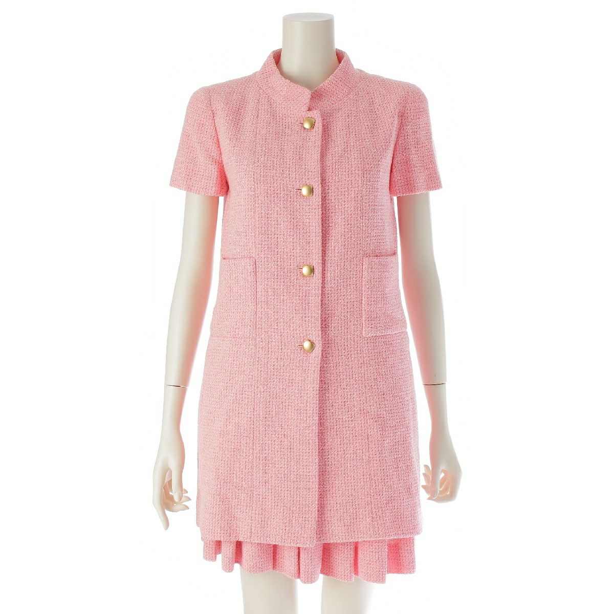 シャネル 01C ウール ツイード 半袖 ロングジャケット プリーツ スカートセットアップ ハイネック 2ポケット ミニ丈 P17003 ピンク 38