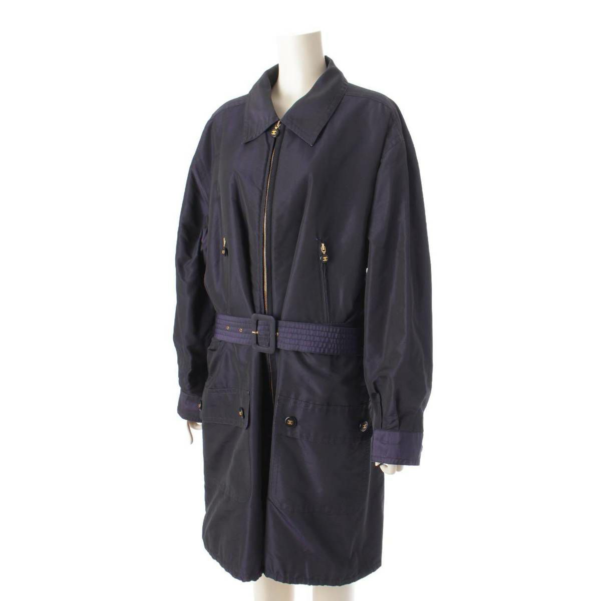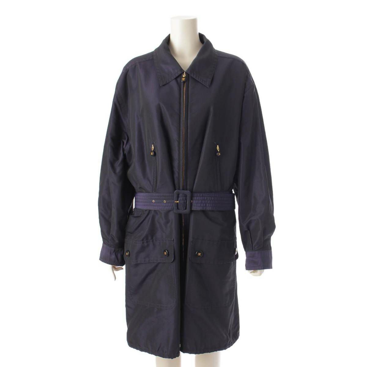 シャネル Chanel 90'S ココマーク シルク ヴィンテージ ステンカラー ベルト コート アウター ネイビー