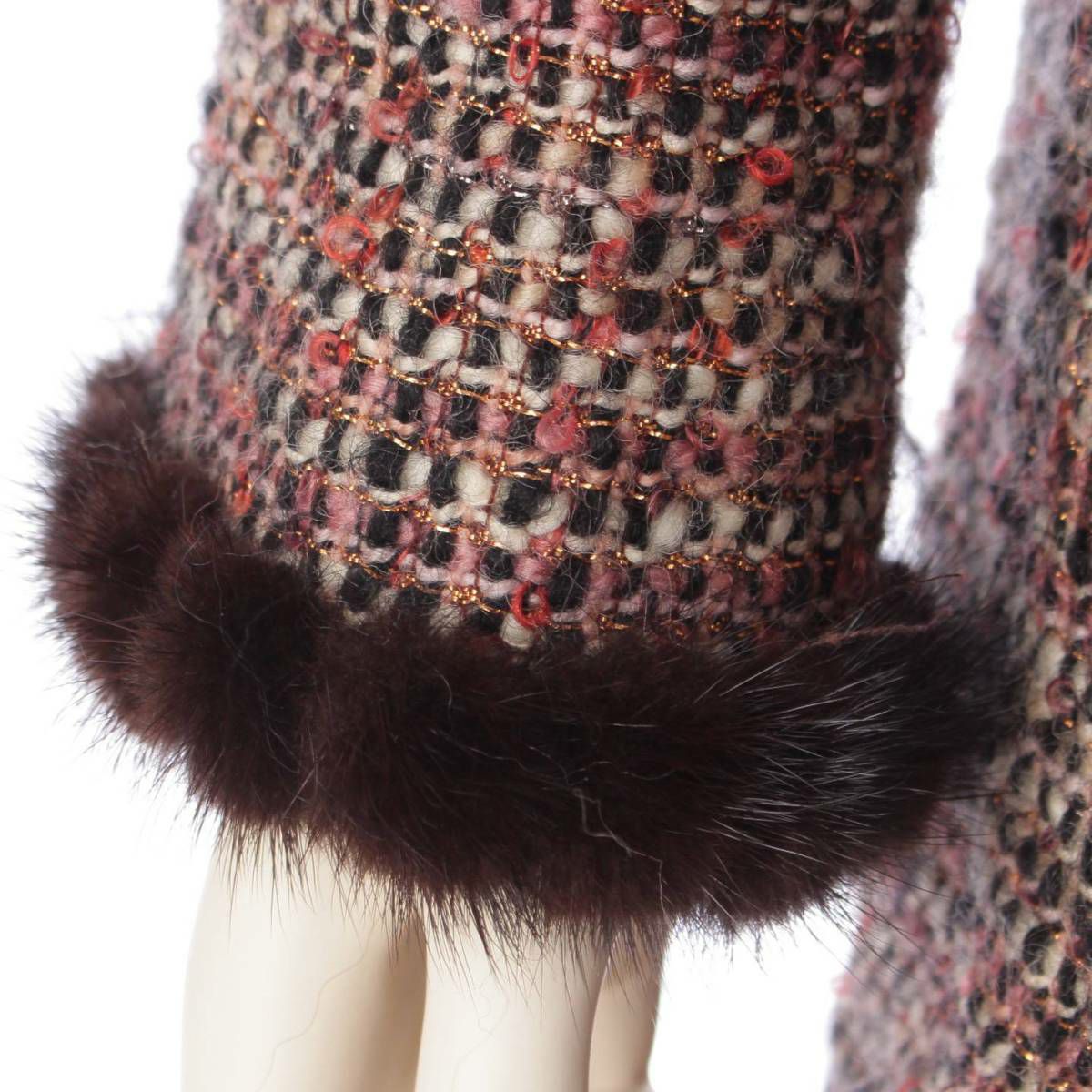 シャネル 03A ツイード×ウール トリムファー ノーカラー コート P21803 ピンク×ブラウン 40