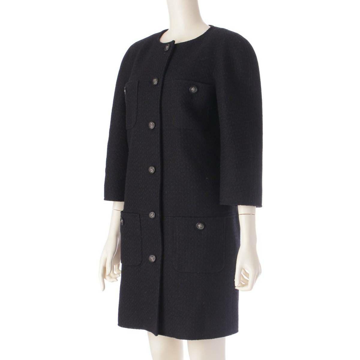 シャネル ライオンボタン ウール シルク ノーカラー コート ワンピース P49853 ブラック 38