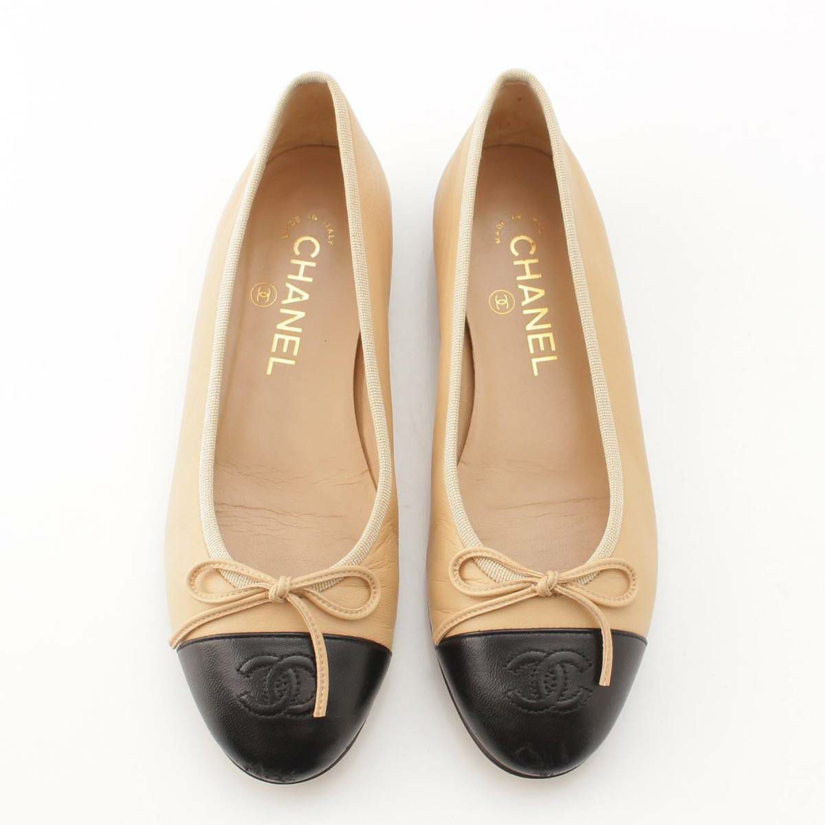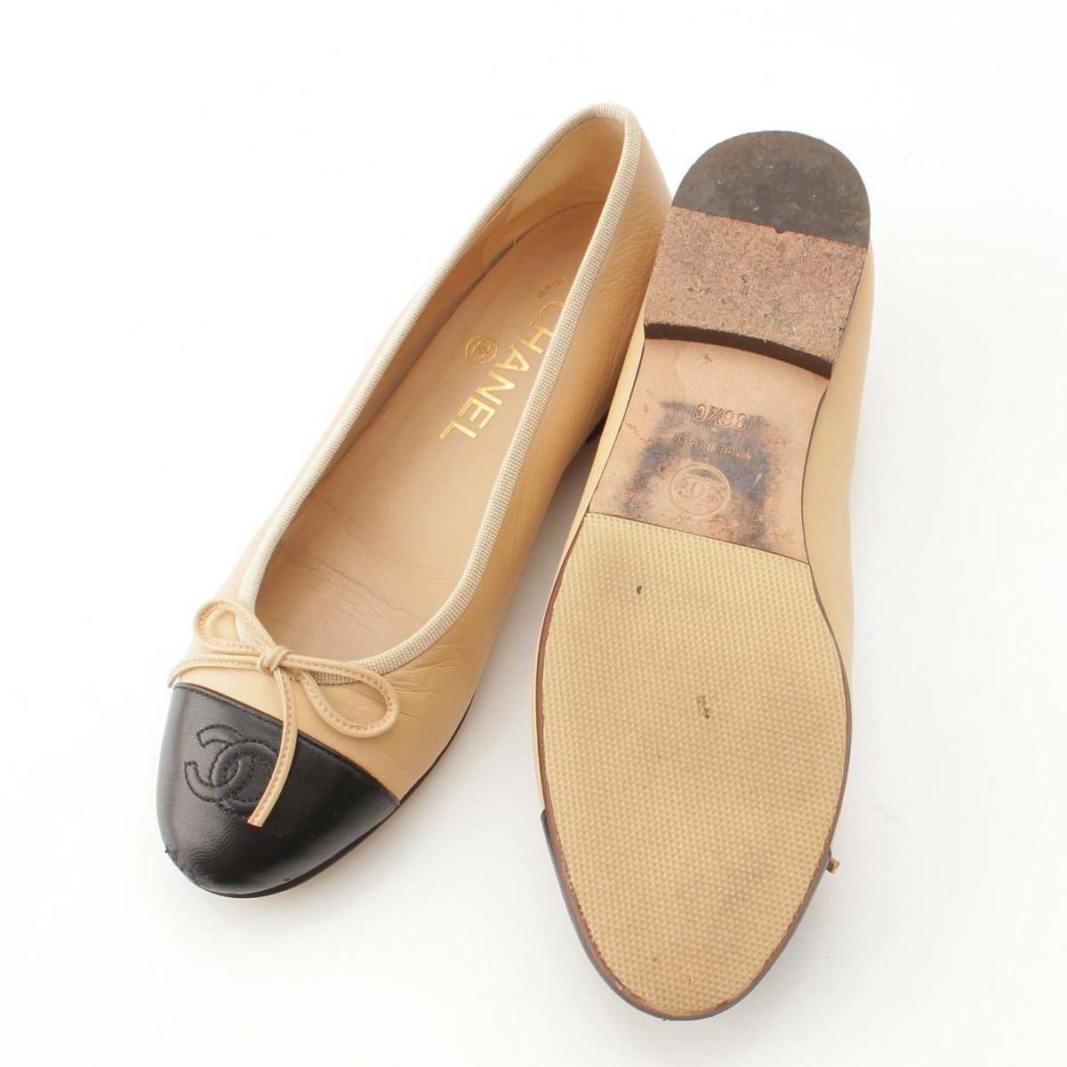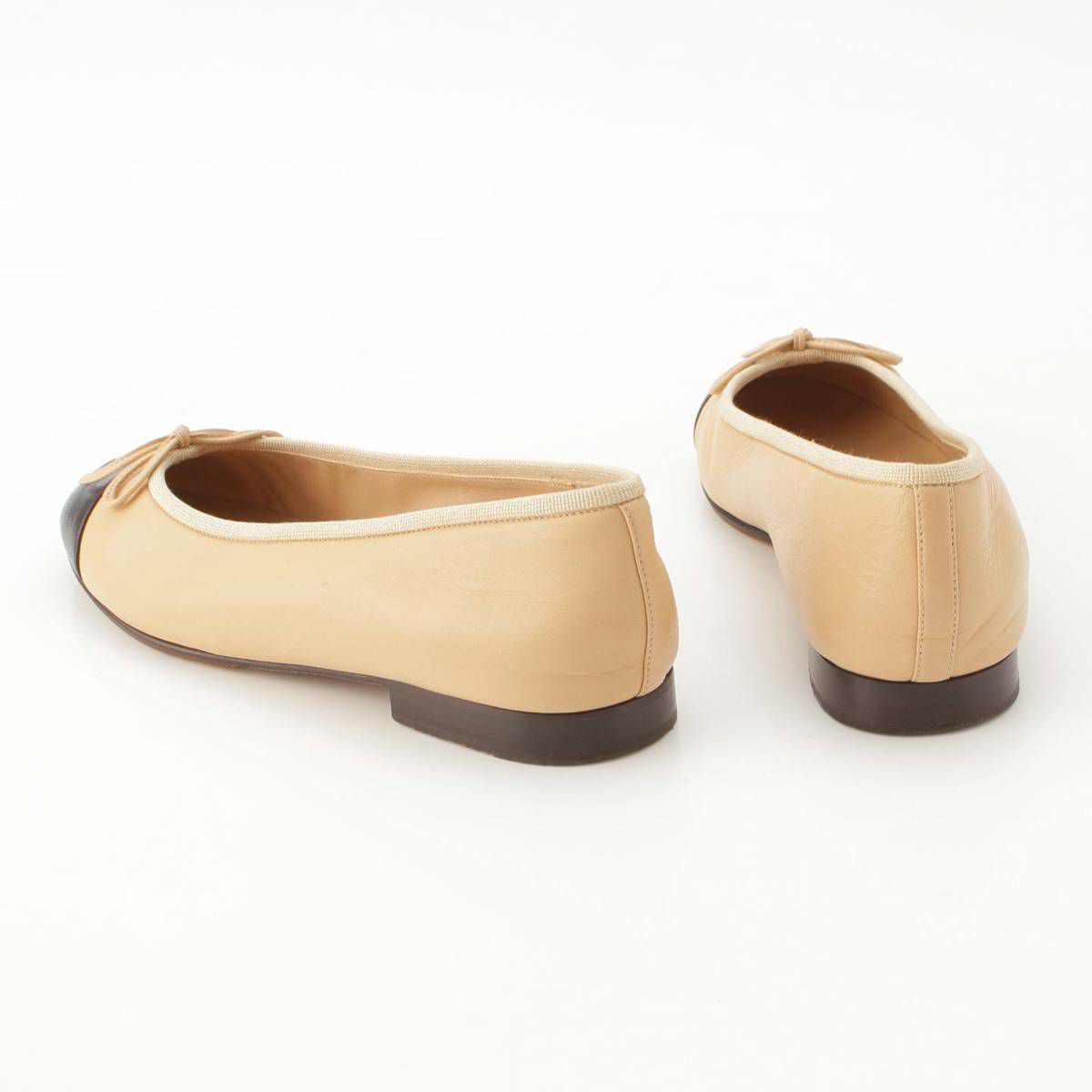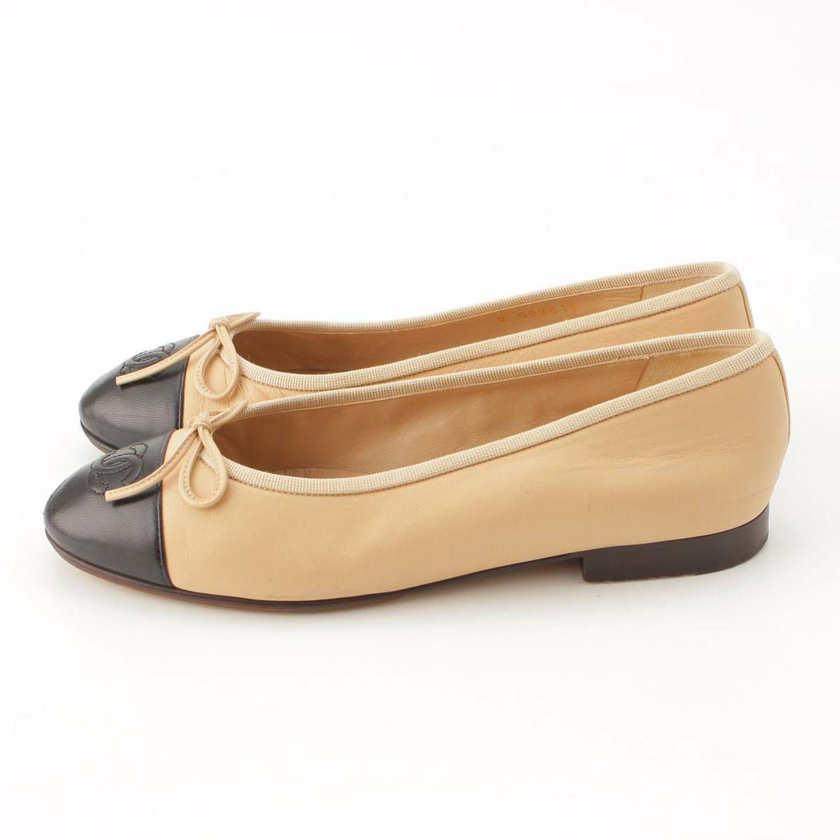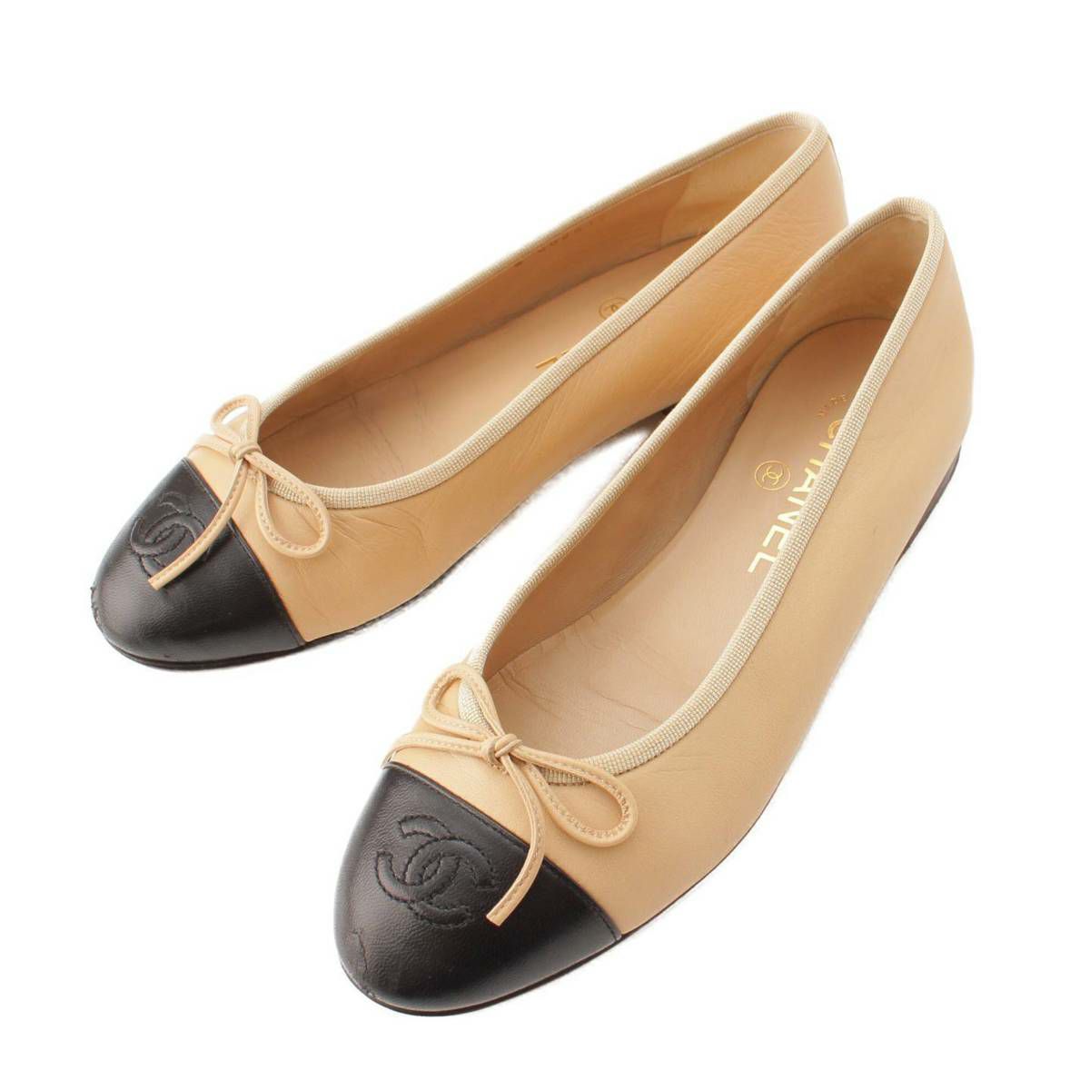 シャネル Chanel 10C バレリーナ レザー フラット バレエシューズ パンプス ベージュ×ブラック 36.5