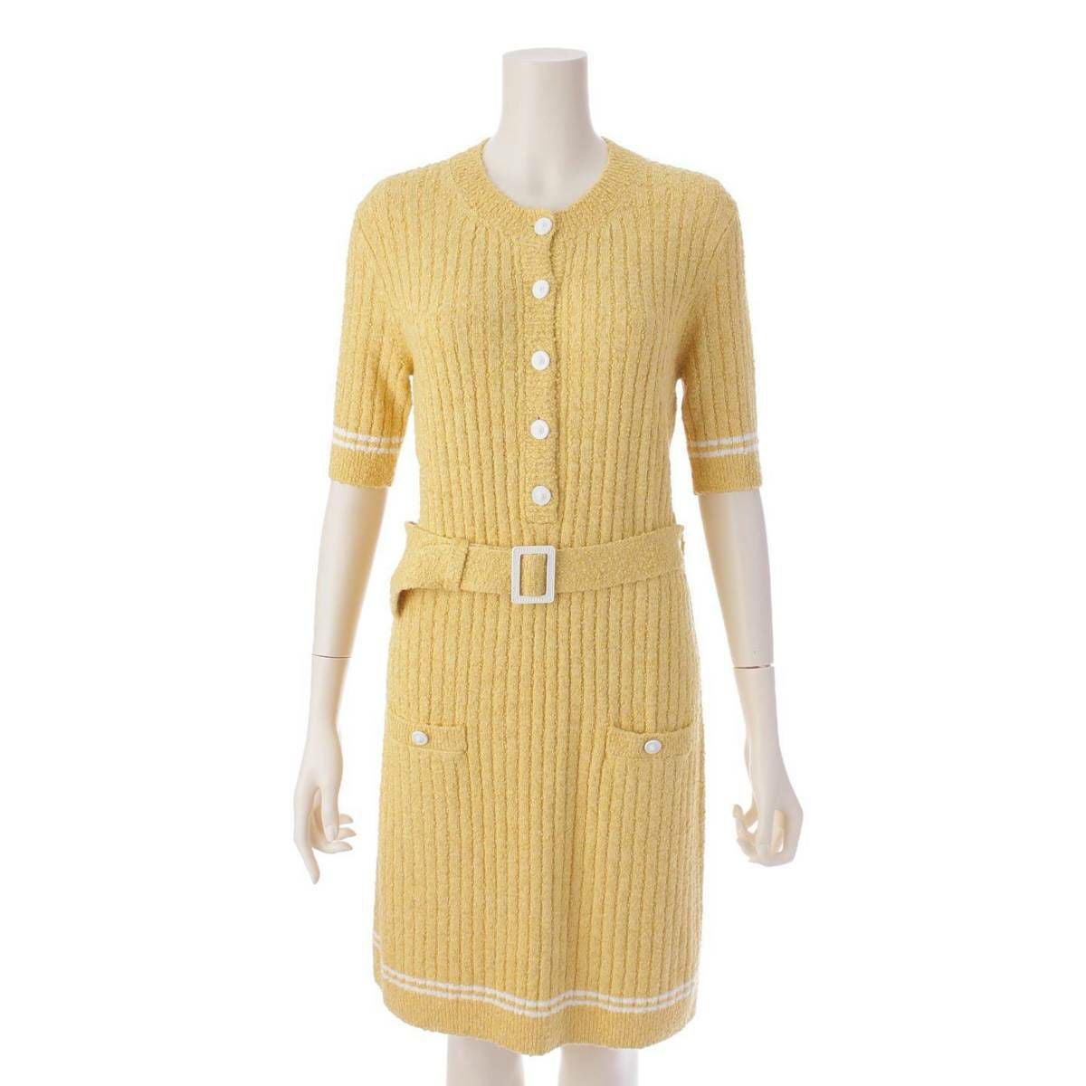 シャネル 22SS ライオンボタン ベルテッド リブニット ワンピース P72176 イエロー 38
