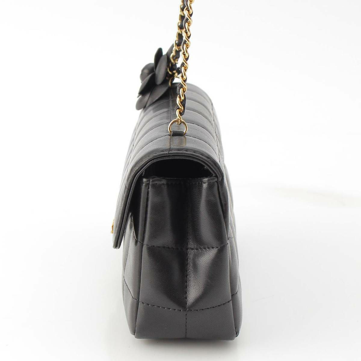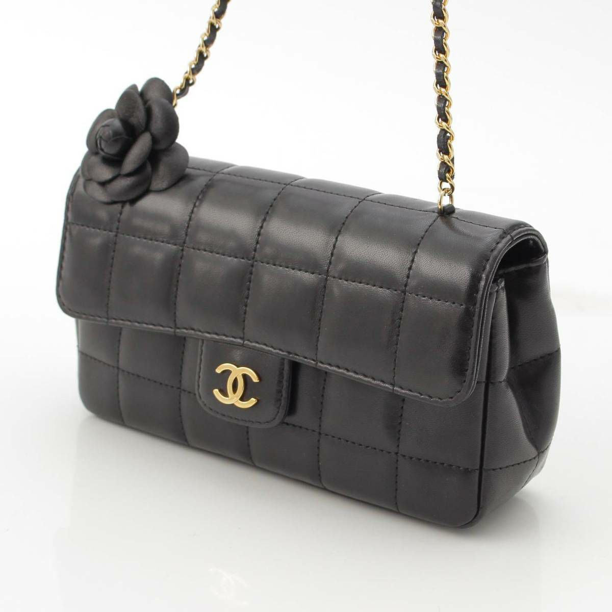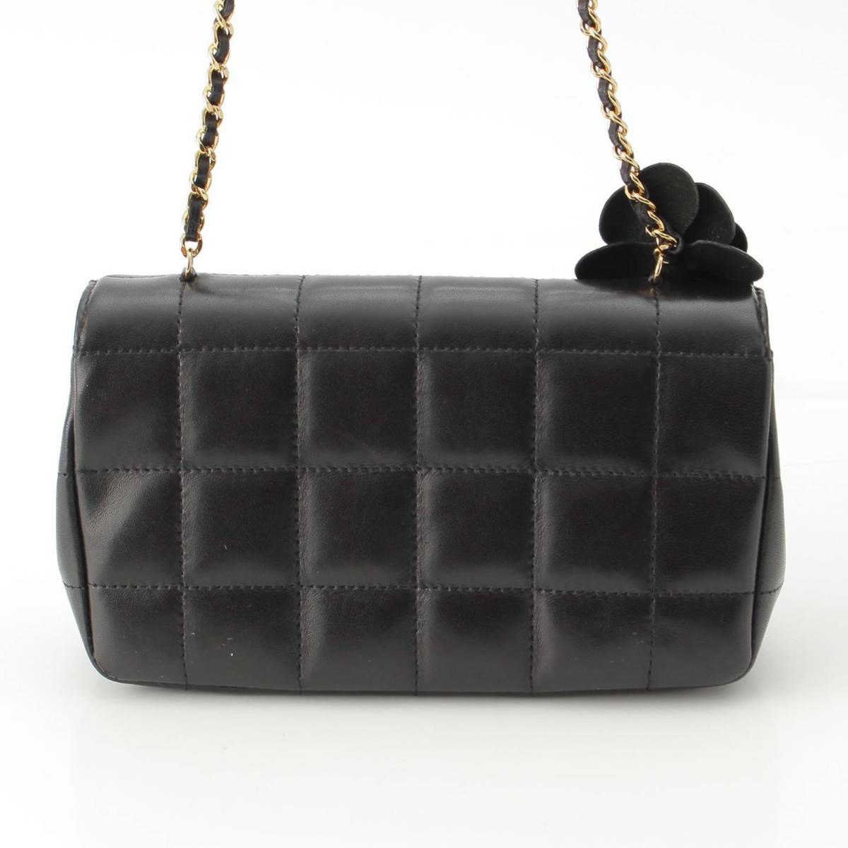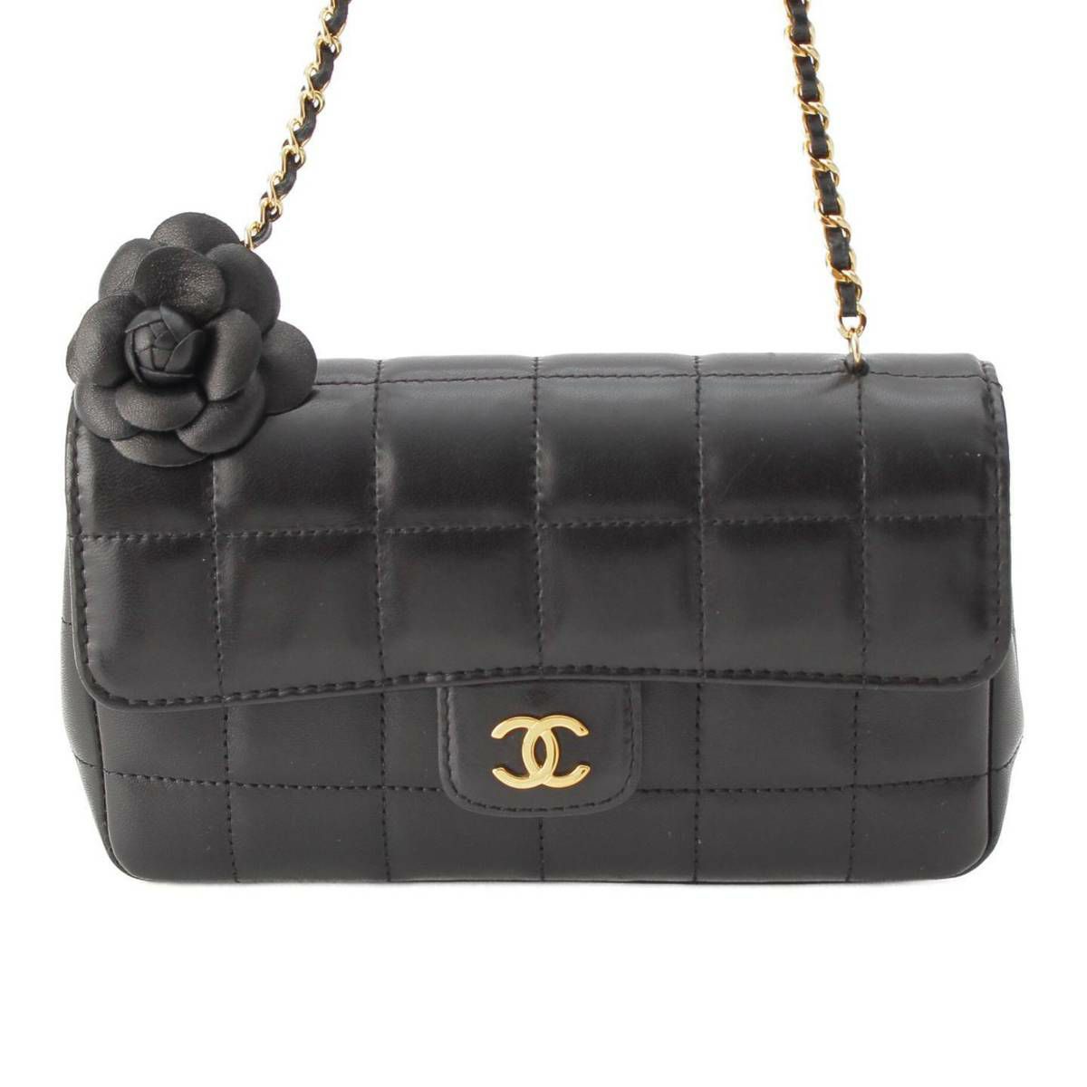 シャネル Chanel 12番台 チョコバー ラムスキン カメリア チェーンショルダーバッグ ブラック