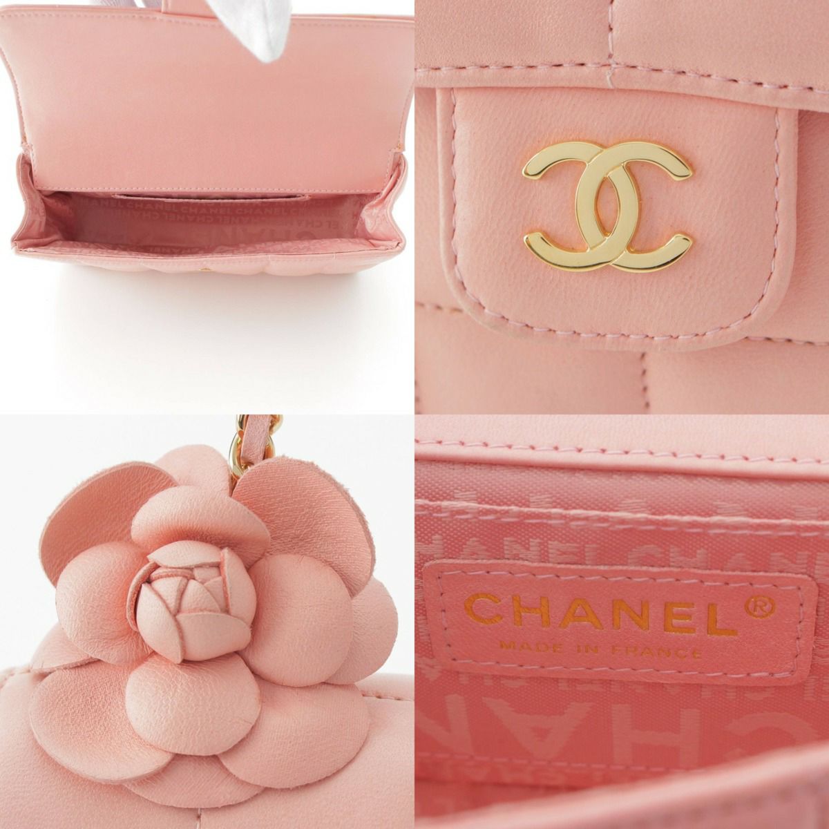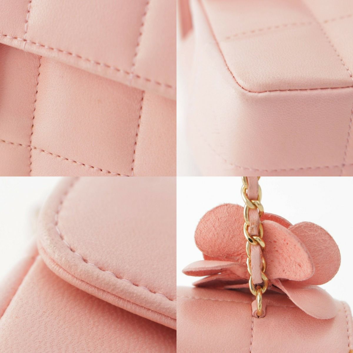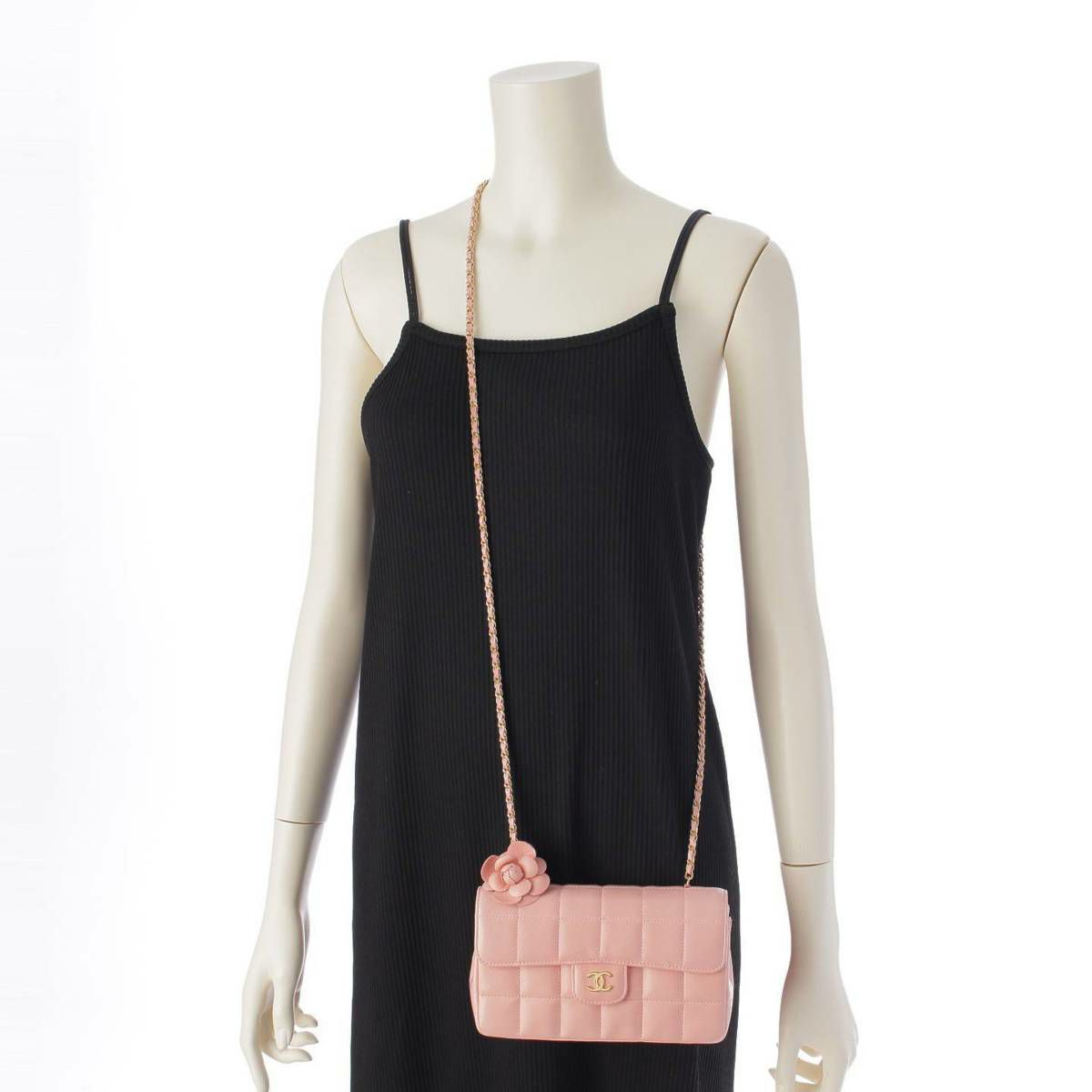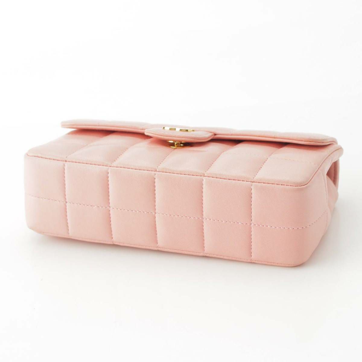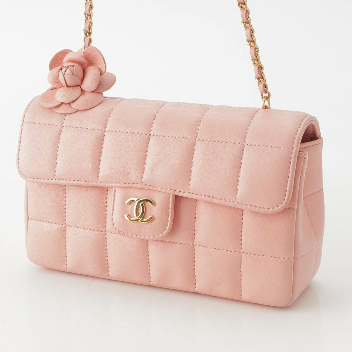 シャネル Chanel 8番台 チョコバー ラムスキン カメリア チェーンショルダーバッグ ピンク
