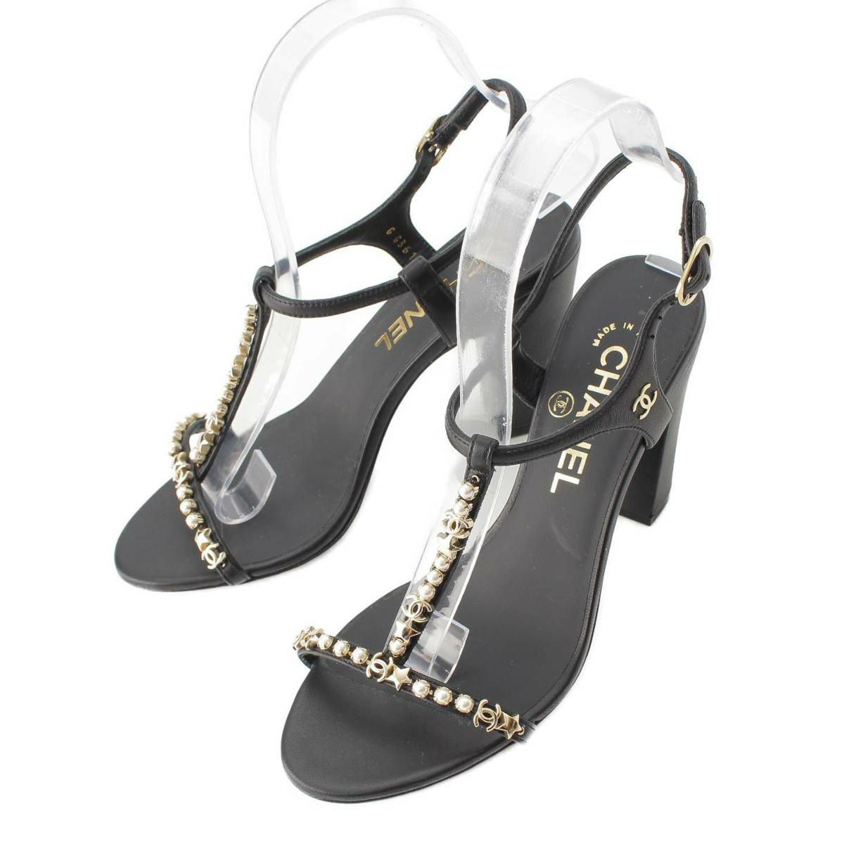 シャネル Chanel ココマーク サテン レザー パールスタッズ サンダル G36121 ブラック 35.5C