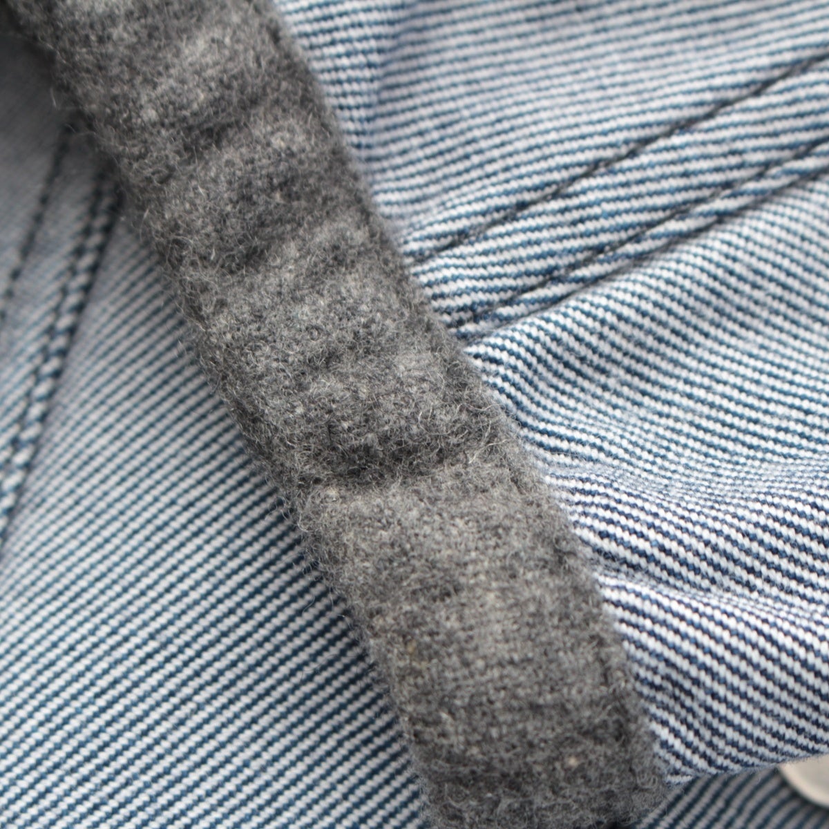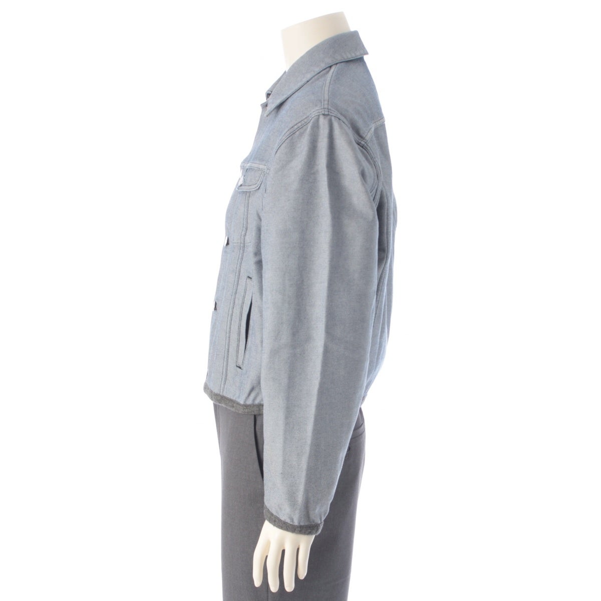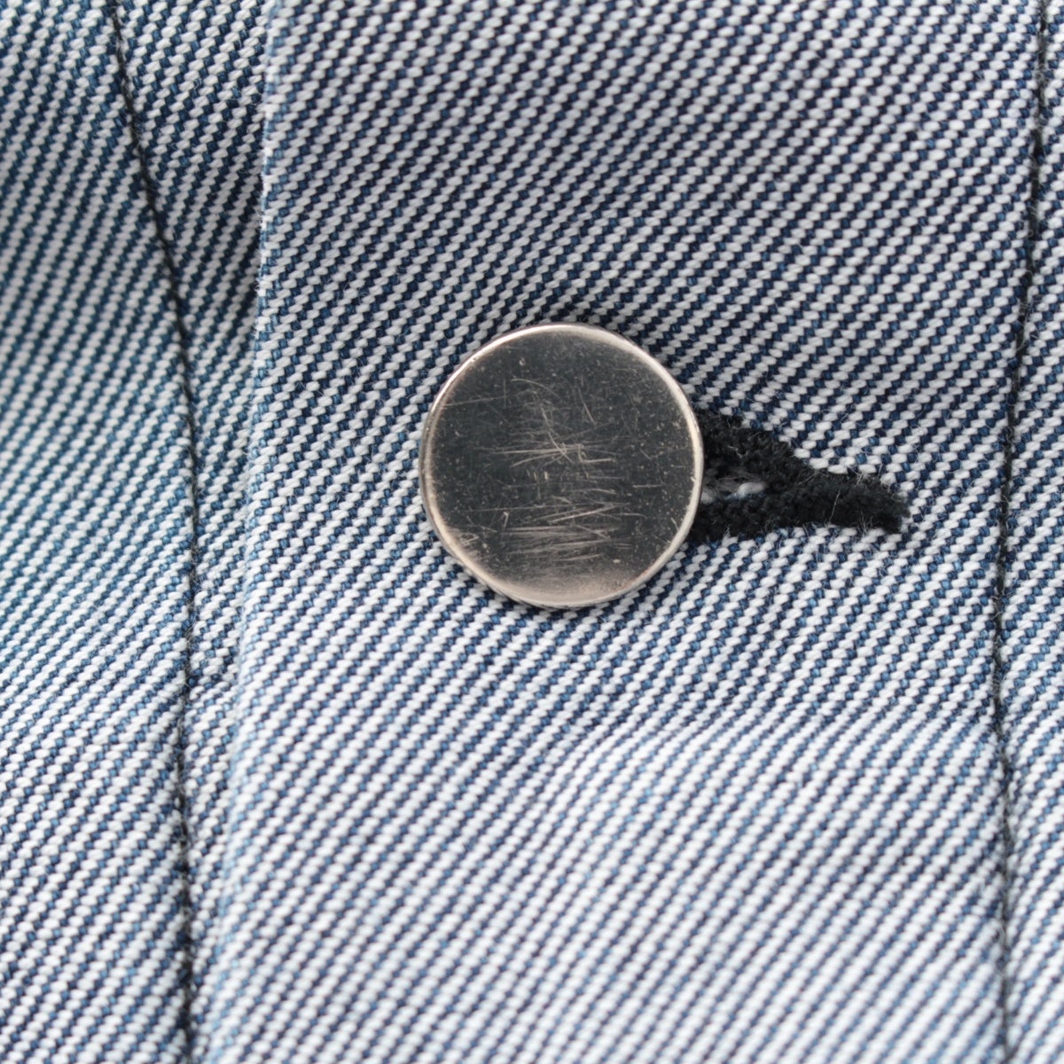 ダメージ箇所: 前身頃:糸引き・黒汚れ・キズ(ボタン)あり 右袖:ヤケあり 袖口:毛羽立ちあり 内側:スレあり、