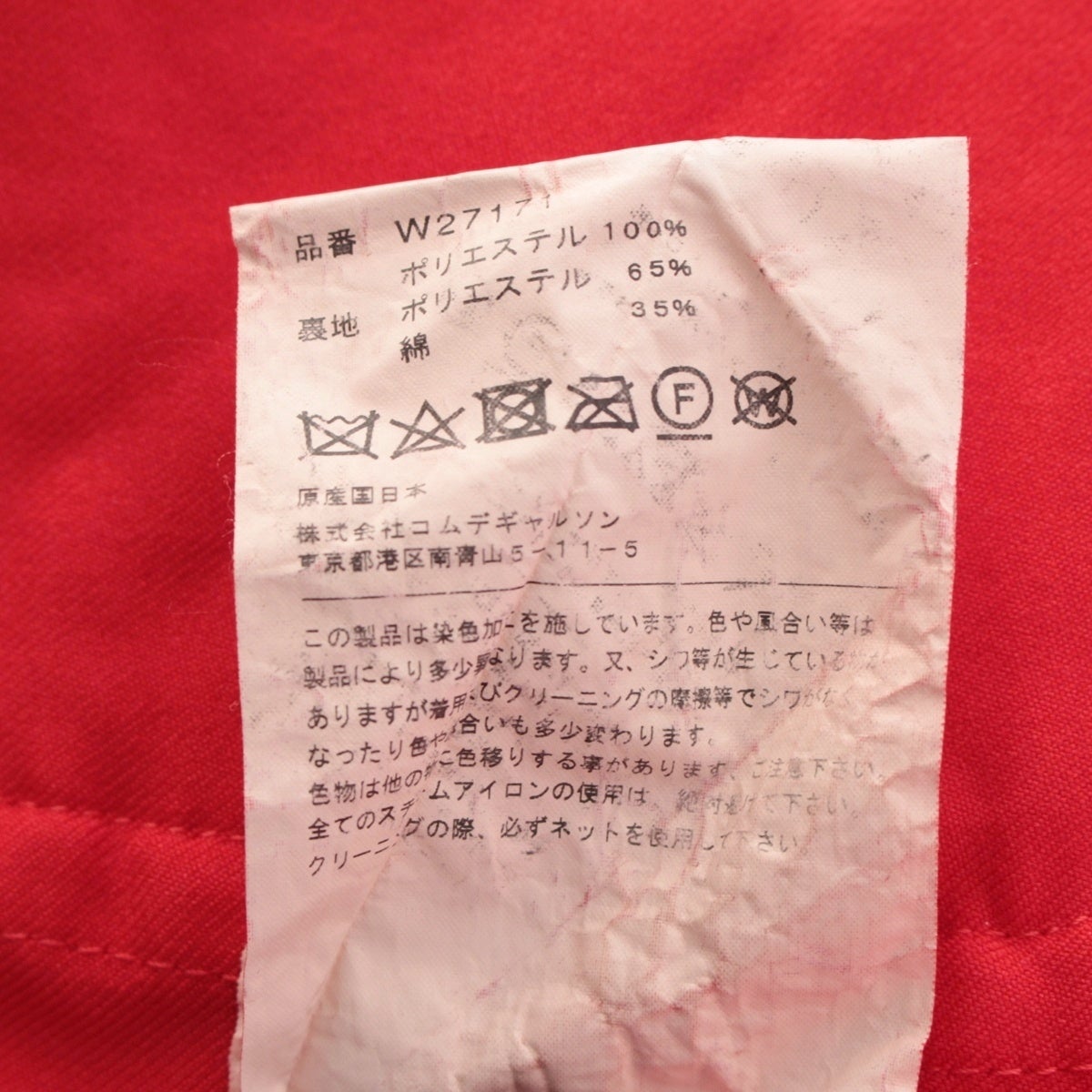 コムデギャルソン ポリエステル 製品染め ポリ縮 縮絨 ジャケット 長袖シャツ W27171 レッド S
