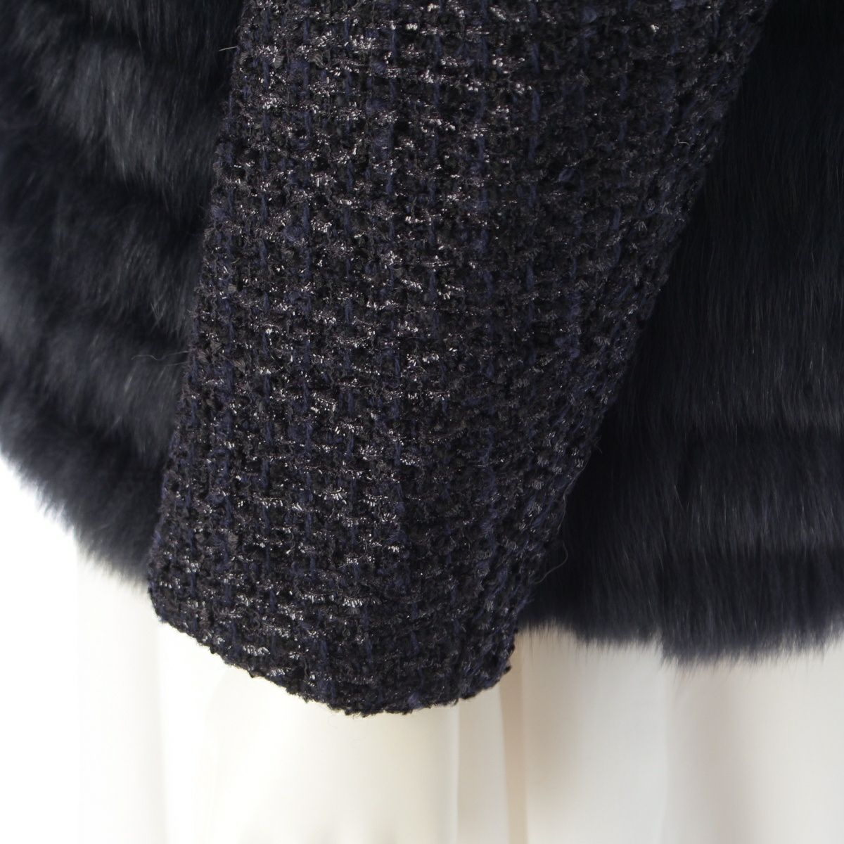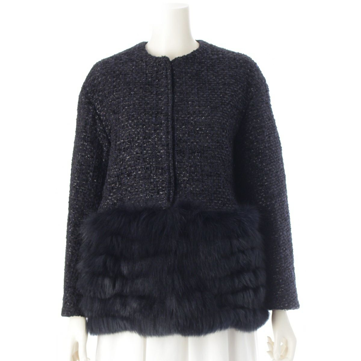 ドゥロワー 22AW ウール ナイロン コットン WINTER2 長袖 ラメツイード フォックスファー ノーカラージャケット アウター 6522-234-0737 ネイビー ブラック 36